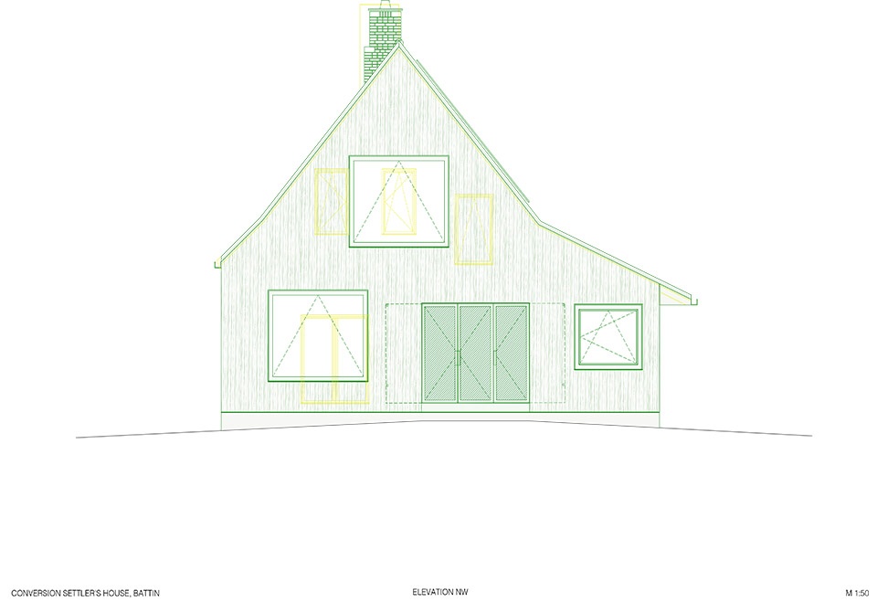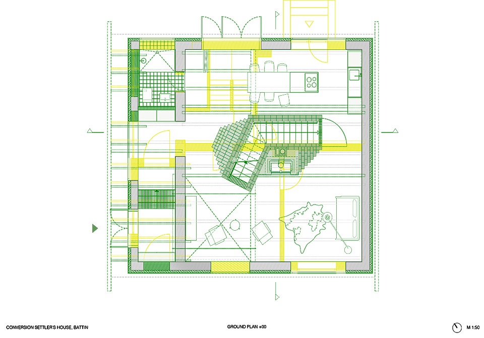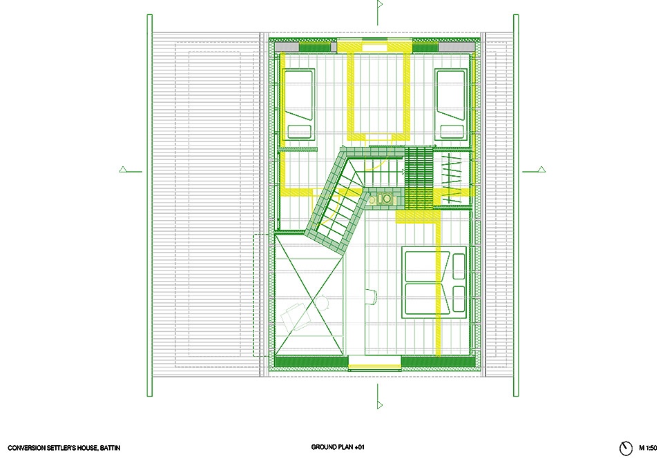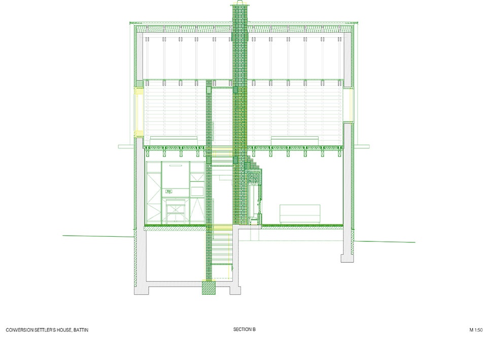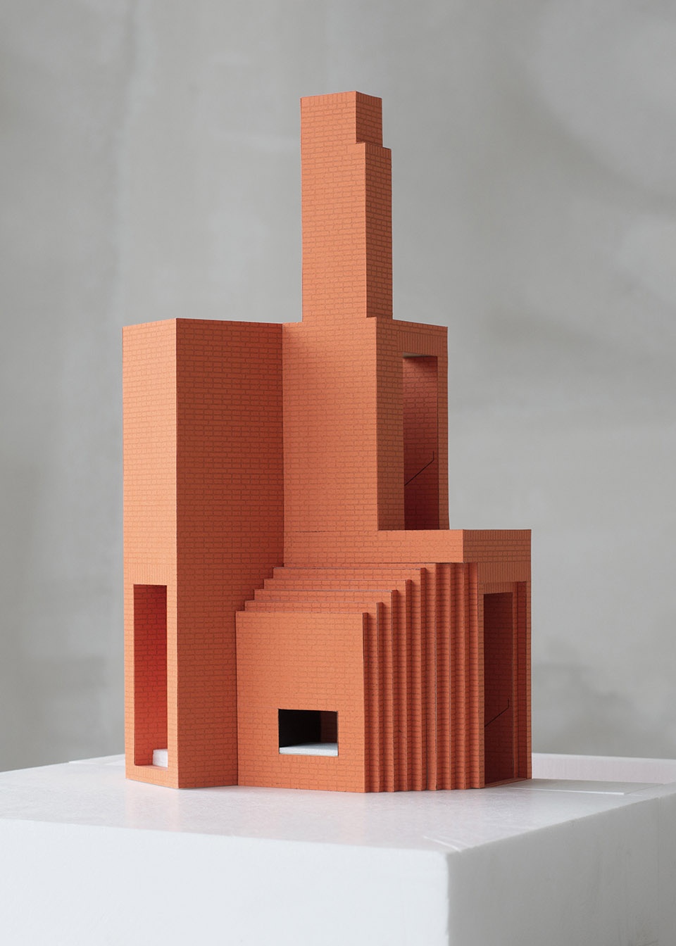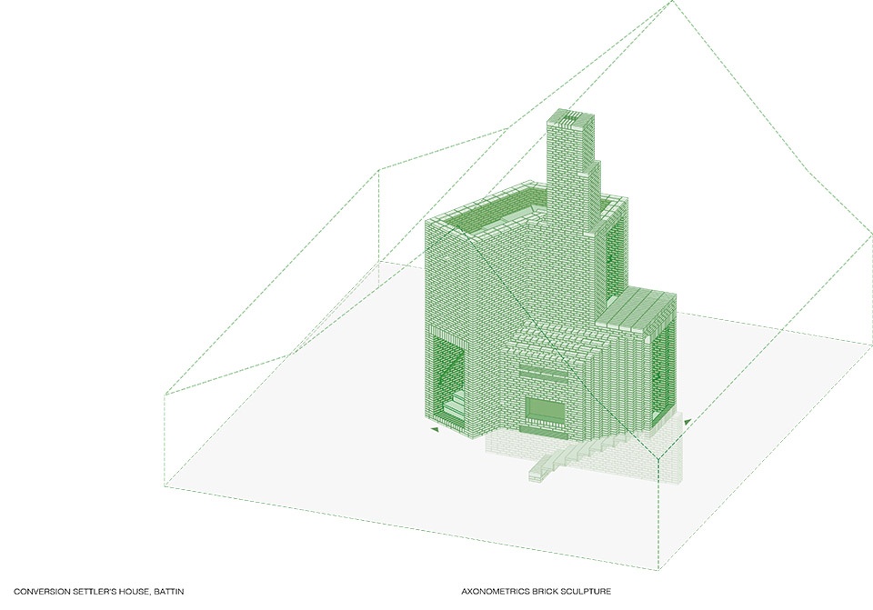 The architectural context is a 1950’s settler’s house in a remote community 150 km north-east of Berlin. The conversion focusses on the interior of the petite, 2-story building. The logics of the interior spaces is reinterpreted with a sculptural room insert. This new spatial element made of exposed brickwork houses a staircase and the fireplace. Its unique quality is created by the precision the few materials are crafted with. The choice of brick format and its jointing follows the gradient of the wooden steps, which are precisely integrated into the brickwork. The shape of the sculptural room insert follows the directions of movement and the visual relationships of the surrounding living spaces. Its design is robust, differentiated and adaptive.