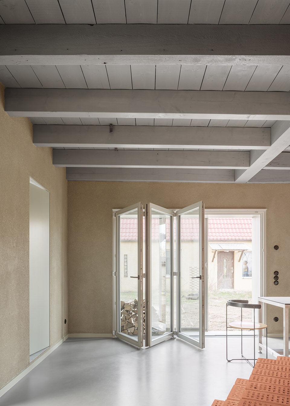 Sustainability is achieved through the reduction of the number of materials, as well as through the simplicity and permanence of the structural interventions. An open matrix of merging living spaces unfolds around the powerful room insert made of exposed brickwork. The atmosphere of the interior spaces is characterized by the interplay of brickwork, clay-plastered existing walls, historical and newly added timber constructions. The kitchen furniture is deliberately designed in contrasting colors with filigree stainless steel construction frames. Perforated window shutters made of powder-coated steel help create the feeling of sleeping outdoors in summer. At the same time they provide cooling at night without any additional air condition system. Where necessary, the existing openings in the façades were enlarged to open up the view of the surrounding landscape.