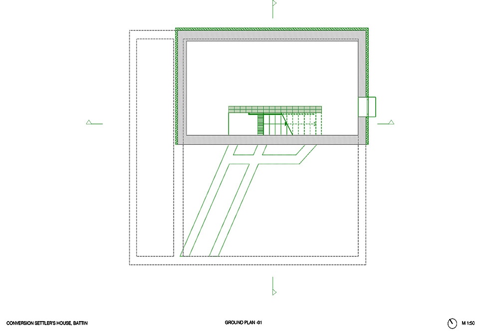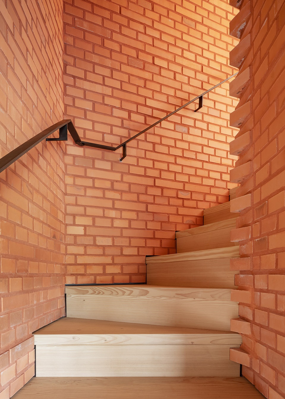 该建筑位于柏林东北150公里的偏远社区,是一栋建于1950年代的定居者住宅。本次改造聚焦于这座小巧的两层建筑的室内空间。设计以雕塑般的空间嵌入体重新诠释了原有室内格局。这一新构筑体采用外露砖石结构,内部容纳了楼梯与壁炉,其独特之处在于材料极简但制作工艺极为精细。砖块的尺寸选择及其拼缝方式精确对应木质阶梯的倾斜角度,使楼梯与砖体浑然一体。嵌入体的形状顺应了使用者的行动路径以及周围居住空间之间的视线关系,其设计既坚实有力,又具细节变化与适应性。