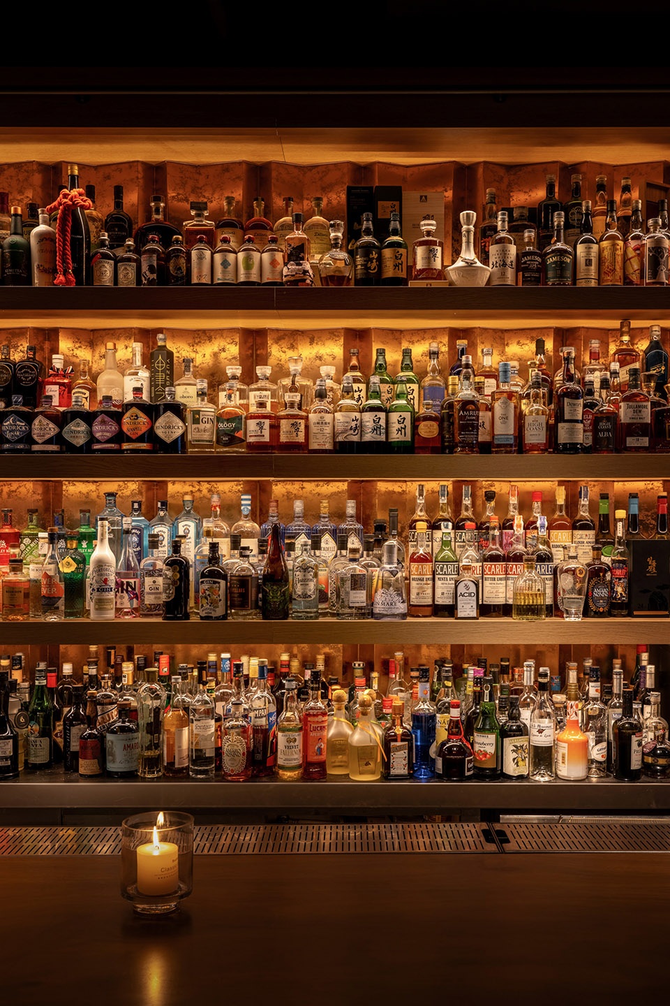 To meet display needs, a layered liquor wall was added beside the bar, with a ladder for access. Reflective, aged metal panels behind the shelves interact with the bottles’ light and shadow, creating a sense of mystery within the space.