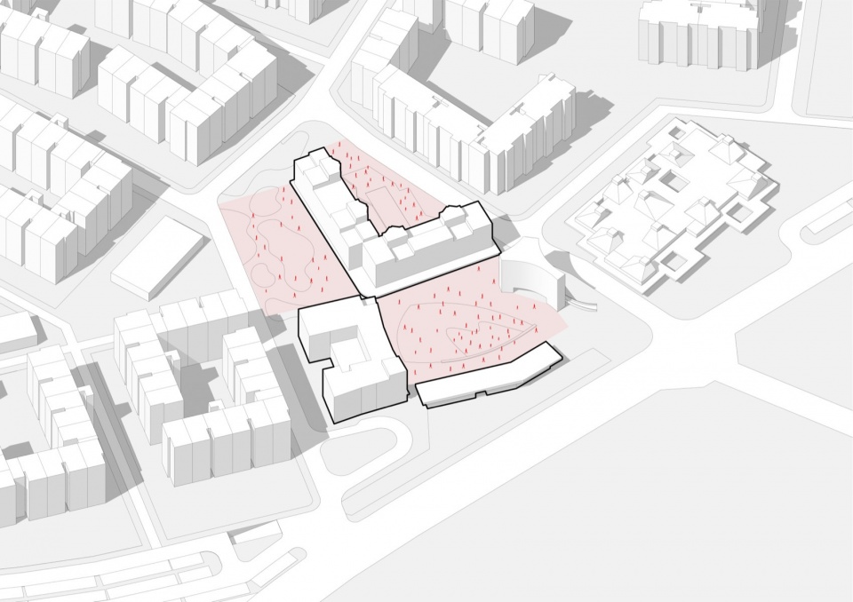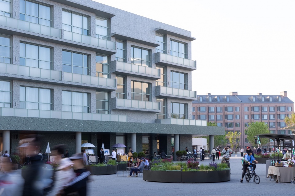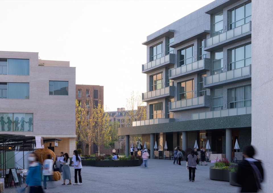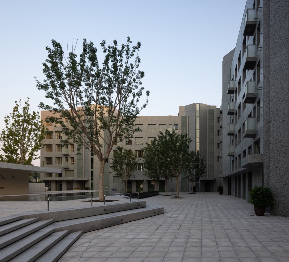 在延续北岸围合式街区的规划模式的同时,我们也在探索一种更具公共氛围的社区空间。友谊湾建筑群打破了周边的网格秩序,降低了建筑体量,将U型平面的酒店和L型平面的公寓角对角布置,与周边建筑共同围合出两个梯形广场和一个三角院落,并在公寓底层设置柱廊和店铺。不同尺度的广场和院落,丰富了友谊湾室外空间公共性的层级,酒店和公寓房间的朝向都有了内外之分,让入居者可以有更多的选择。对角连接的广场沟通南北区的步行道路,人们也可以从各个方向穿过建筑进入三角院落。酒店、公寓和北岸礼堂共同围合的广场是南区公共生活的核心,酒店朝向广场的立面内凹,增加了对广场的包围感,希望能给人们留下亲切的印象。