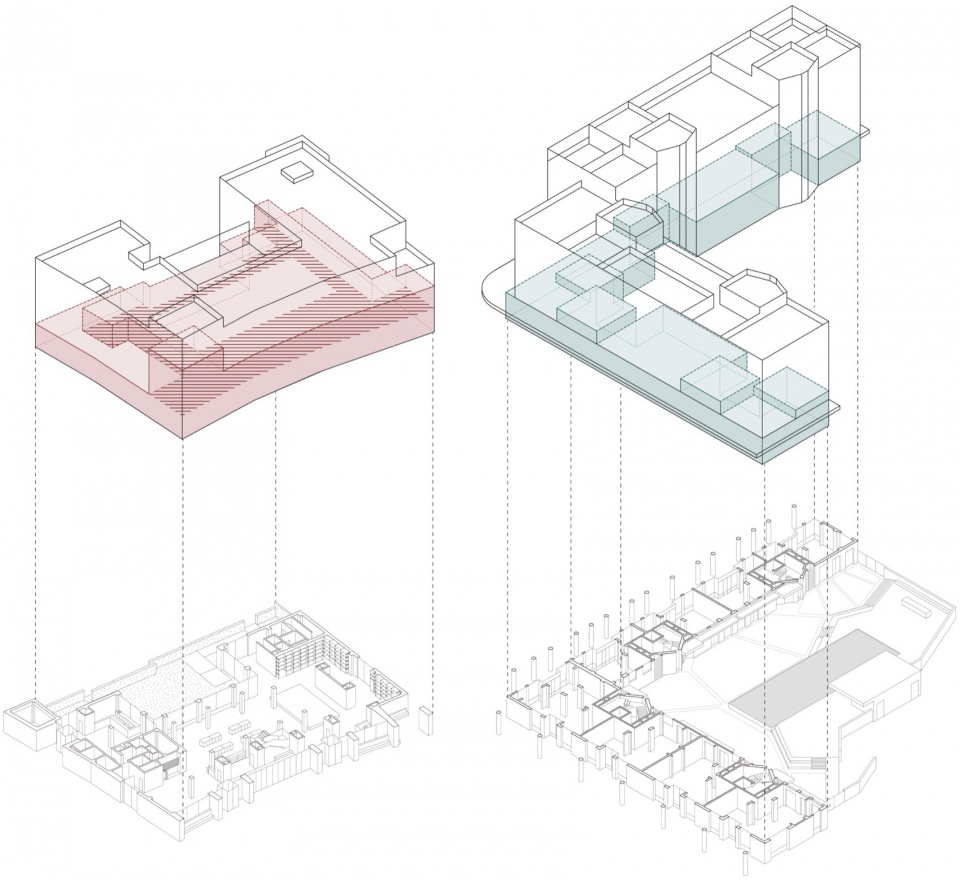 我们希望通过功能的复合和平面布局的开放,让友谊之家俱乐部酒店成为社区的共享客厅。酒店的入口和大堂位于建筑一层东南角。一层和二层的主要空间都保留给了公共功能,两层通高的集会大厅(Forum Space)向南侧的庭院打开,其余三面分布着零售空间和画廊空间,将聚会、文化讲座、商业活动、音乐会和展览等活动容纳在一起。这里也是酒店功能和外部广场的自然过渡,使建筑的底层具有多个面向的公共性,人们可以从四周进入建筑,自由地穿过这个空间。