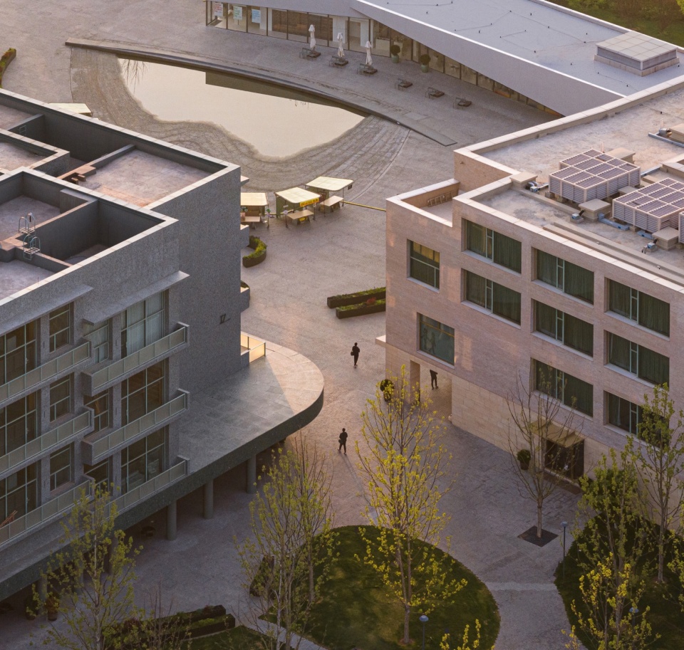 While continuing the planning pattern of the enclosed street block in the North Shore, we are also exploring a more public-oriented community space. The building complex of Youyi Bay breaks the grid order of the surrounding area, reduces the volume of buildings. The hotel with a U-shaped plan and the apartment with an L-shaped plan are arranged diagonally, enclosing two trapezoidal squares and a triangular courtyard together with surrounding buildings. Retail arcade is set on the ground floor of the apartments. The different scales of squares and courtyards enrich the hierarchical public nature of the outdoor spaces at Youyi Bay. The orientations of hotel and apartment rooms are divided into internal and external, providing residents with more choices. The diagonally connected squares connect the pedestrian roads of the north and south zones, and people can enter the triangular courtyard from all directions through the buildings. The square enclosed by the hotel, apartments, and The chapel of music is the core of public life in the southern zone. The hotel’s facade facing the square is recessed, adding a sense of enclosure to the square, aiming to leave people with a friendly impression.