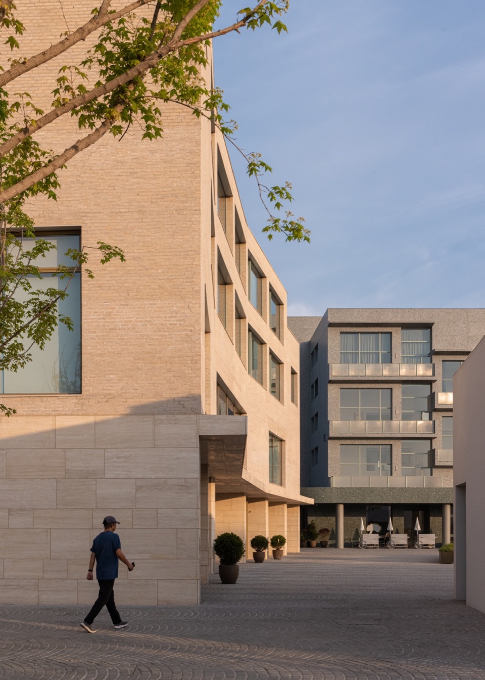 Facing the main square, the hotel’s facade boasts a rustic texture. The unevenness of the cement bricks allows for subtle tonal variations, blending with mortar joints to resemble a single limestone block. The first and second-floor lobbies showcase exposed raw concrete frameworks, evoking a warm feeling akin to wooden architecture through mineral pigments and wooden formwork. This structural approach necessitates precise integration of civil, mechanical, finishing, and curtain wall elements. Exposed one-way ribbed beams connect the gallery to the lobby, allowing sunlight to filter through and illuminate the entire space.