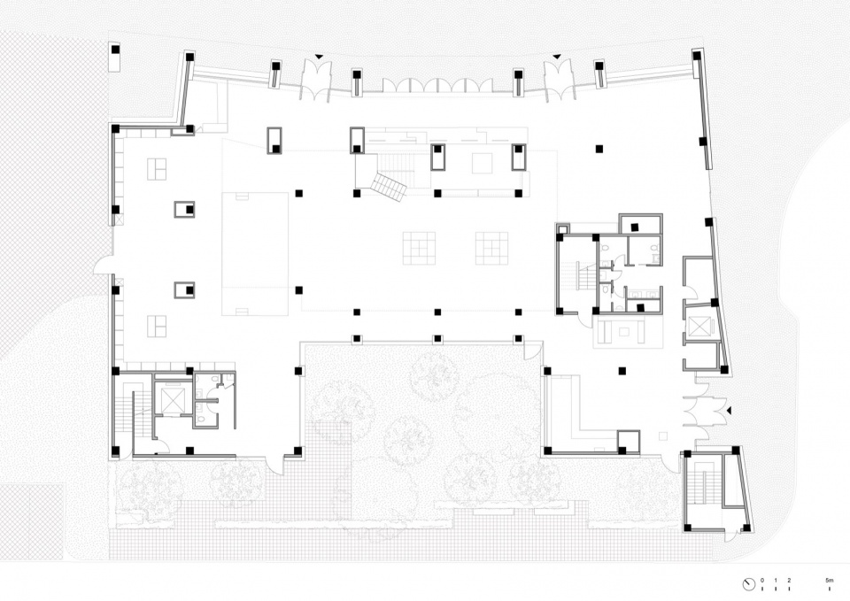 We aim to transform the hotel into the community’s shared living room through diverse functions and an open floor plan layout. The hotel’s entrance and lobby are positioned at the southeast corner of the first floor. The main spaces on the first and second floors are dedicated to public functions, with a two-story-high forum space opening to the courtyard on the south side. The remaining sides host retail and gallery spaces, accommodating gatherings, cultural lectures, concerts, and exhibitions. This serves as a natural transition between the hotel and the external plaza, enriching the building’s ground floor with a vibrant public character, facilitating access from all sides, and allowing free movement through the space.