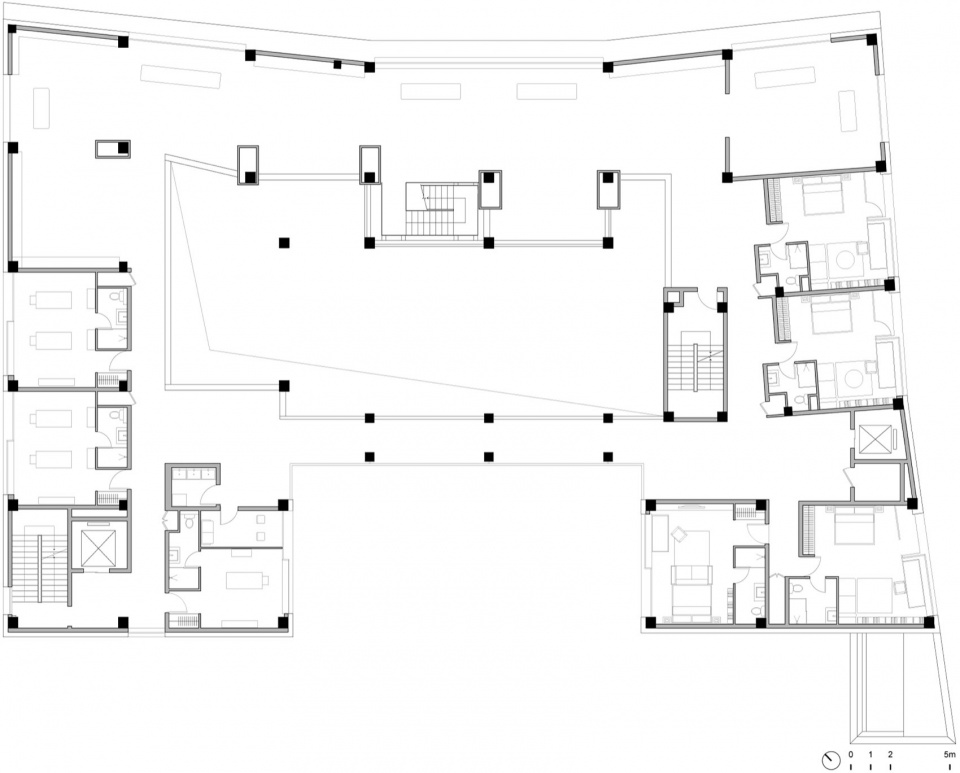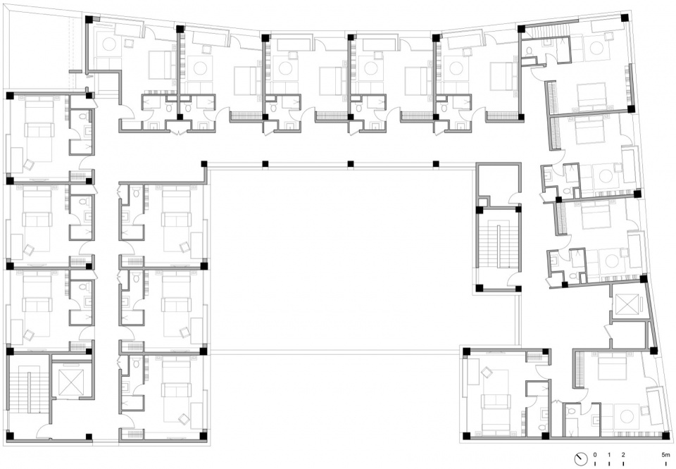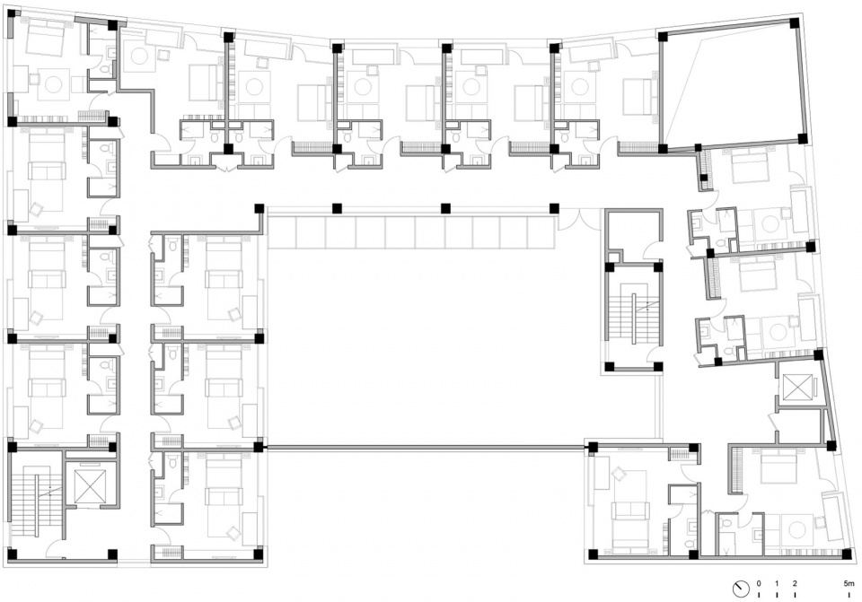 围合成U型的36间客房,一部分面对内庭,一部分朝向广场。根据位置和朝向各不相同,房型略有差异,能看到海的房间布置了可以远眺的阳台,内向安静的房间设有可以打开的落地窗。顶层两个转角是两个特别的房间,有4.5米高的loft起居室和两个方向的开窗,视野开阔。从广场望去,转角高起的客房像是城堡的塔楼。