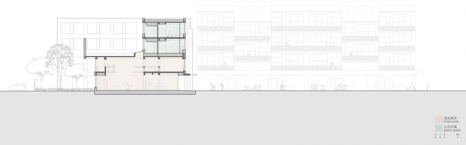 ▼酒店底层和外部广场的联系,使建筑的底层有了面向社区的公共性,The connection between the hotel’s ground floor and the plaza creates a sense of community-facing publicness
