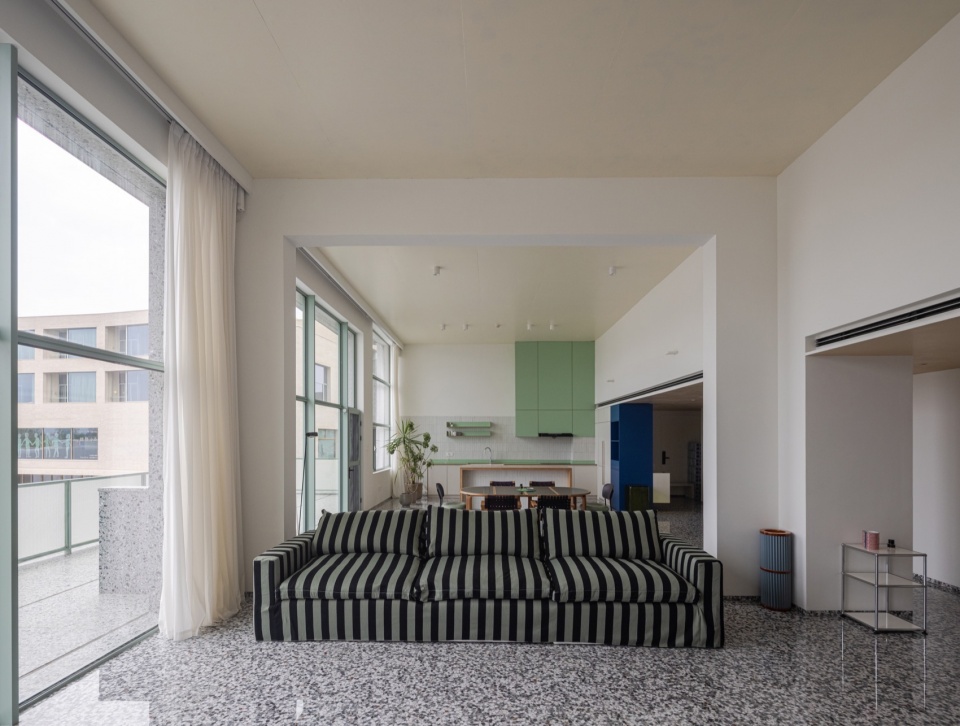 公寓有一个可以被定义为“工作室”的大客厅,面宽8米,层高4.5米,配有阳台、开放式厨房和餐台。沙发和书架围合出休息区,窗边有超长的转角式工作台。这里不仅适于平日的文学、绘画、音乐等艺术创作活动,也能容纳周末和节日的沙龙。客厅的天花是裸露的清水混凝土,我们在上面刷上了薄薄的一层白色面漆,没有批涂腻子,这样保留了混凝土的坚硬质感。混凝土板延伸至室外形成阳台,让室内空间的秩序在立面上呈现出来。