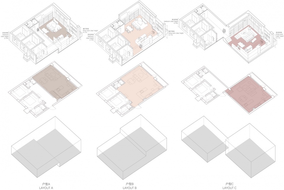 每户的客厅朝向广场,卧室朝向内院,两边有不同的风景。客厅和卧室之间是2.4米宽的前厅,既是入口空间,也是活动与休息区之间的过渡。每户的卧室3米层高,与客厅相差1.5米,利用这个高差将三个户型单元嵌合在一起,创造出一梯一户的入户体验。