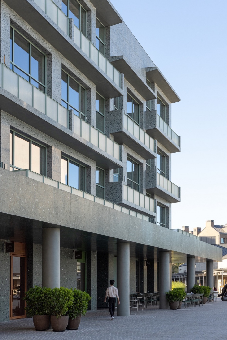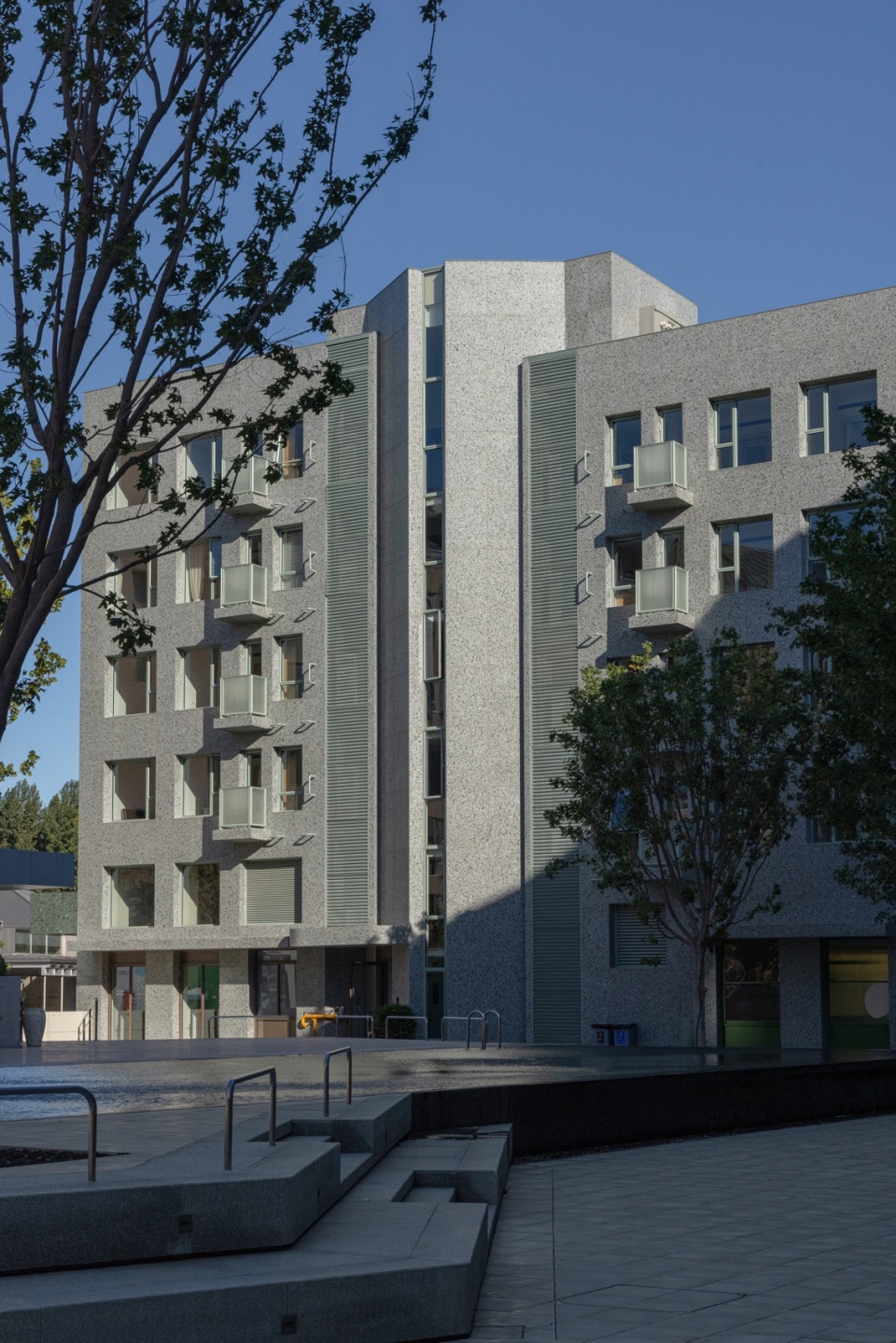 我们希望赋予公寓简单而现代形象,选择了绿色矿石为主要骨料的淡绿色预制水磨石板作为外立面材料。水磨石板是一种丰富多变的材料,需要反复试验石子的大小、种类以及底色的搭配,才能在各种观看距离上都能呈现出好的可视效果。