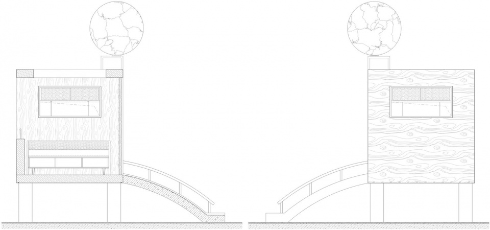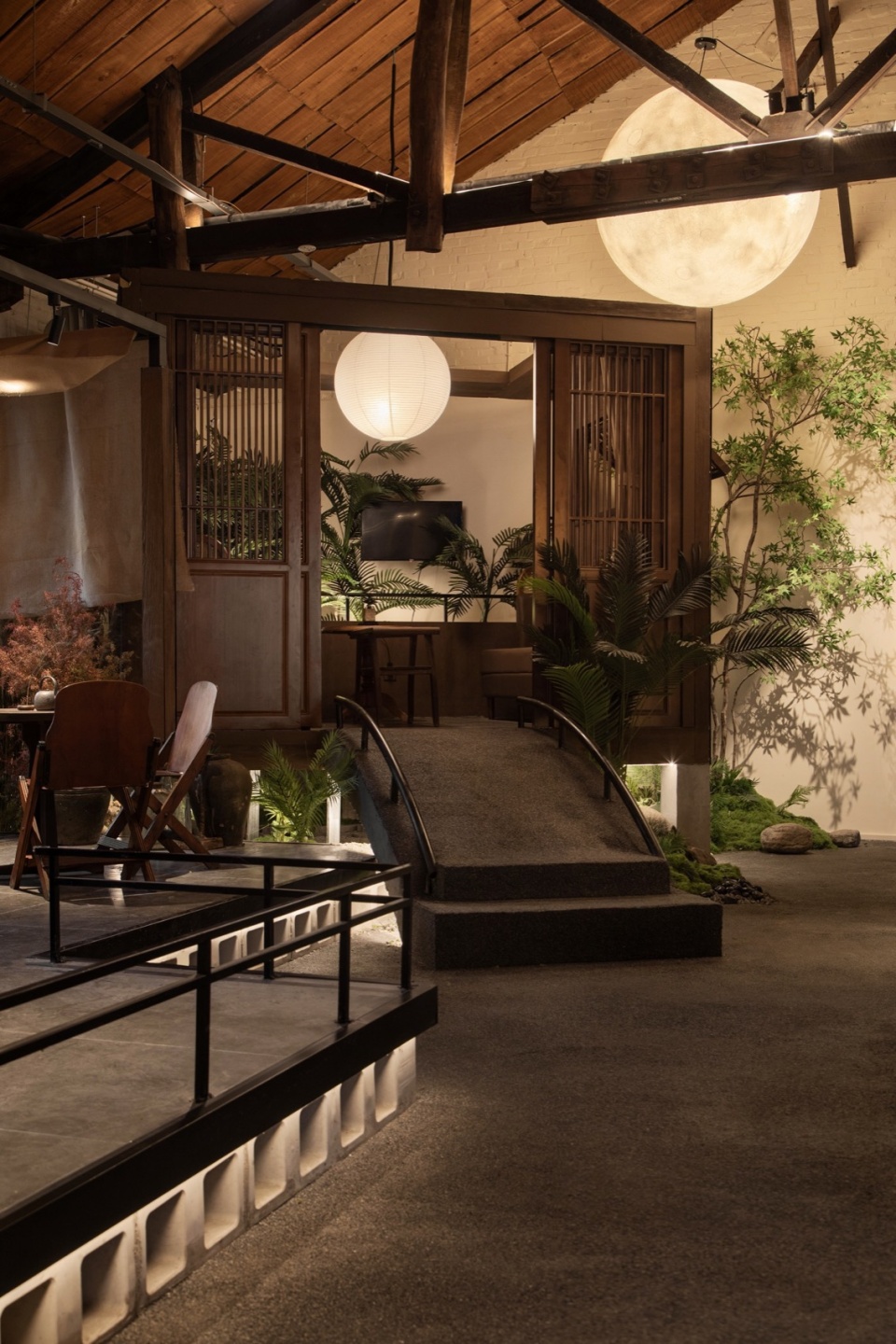将自然元素大规模引入工业空间,是对 “内建筑” 理念与古典园林造景智慧的创新性实践。日本建筑师原广司提出的 “内建筑” 理论,强调在建筑内部创造相对独立又与整体空间相互关联的 “微型建筑”。在致朴茶肆中,通过坡道构建上下两层空间,打造出 “上房揭瓦” 的喝茶区域与‘’湖中小亭‘’,正是这一理论的具象化呈现。这些人工搭建的空间形态,犹如嵌入工业空间的 “微型建筑”,打破了厂房原有的规整格局。上层的喝茶区域模拟 “上房揭瓦” 的趣味场景,使人仿佛置身于老院子的屋顶,俯瞰全景;下层的‘’湖中小亭‘’以独然而立的姿态呼应自然,重现传统园林 “亭台水榭” 的雅致意境。两者通过坡道相连,重塑空间秩序,形成独特的立体叙事。人们在上下穿行中,不仅实现了空间的转换,更收获了如在老院子中穿梭、于湖畔亭间品茗的沉浸式体验,赋予茶饮空间独特的故事性与体验感。