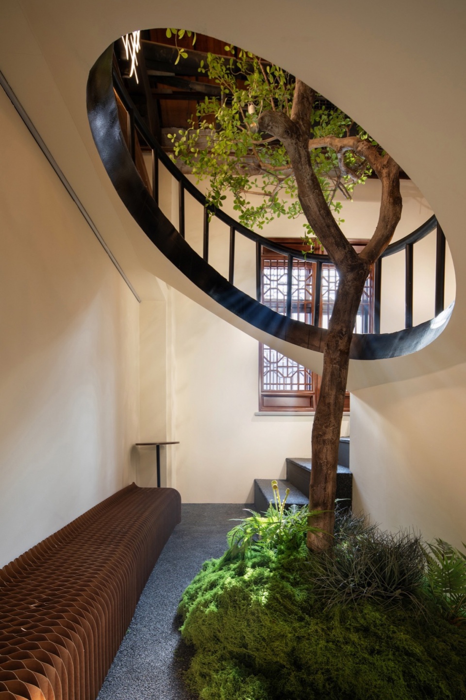 In landscaping, the teahouse uses the classical garden technique of “clever borrowing”, bringing in tall trees, moss and ferns to turn the factory into a mountain forest. Customers feel immersed in nature while drinking tea. Gauze curtains and latticed windows frame greenery, blurring the line between man-made and natural. Old and new elements blend to keep retro charm and modern texture, making the factory a modern carrier of traditional tea culture.