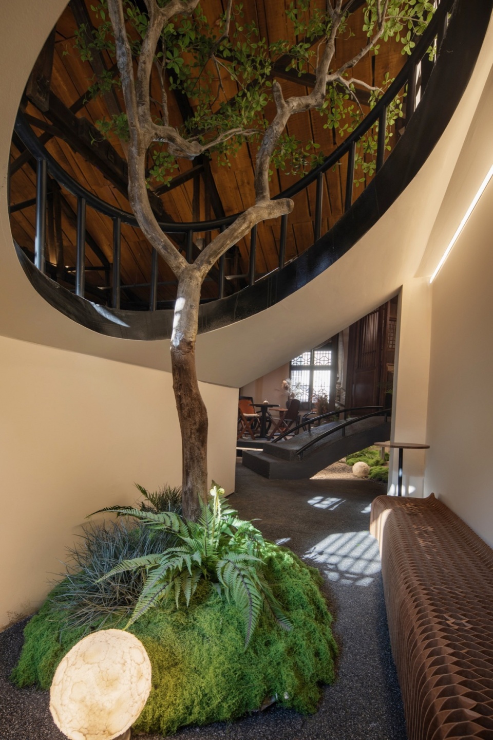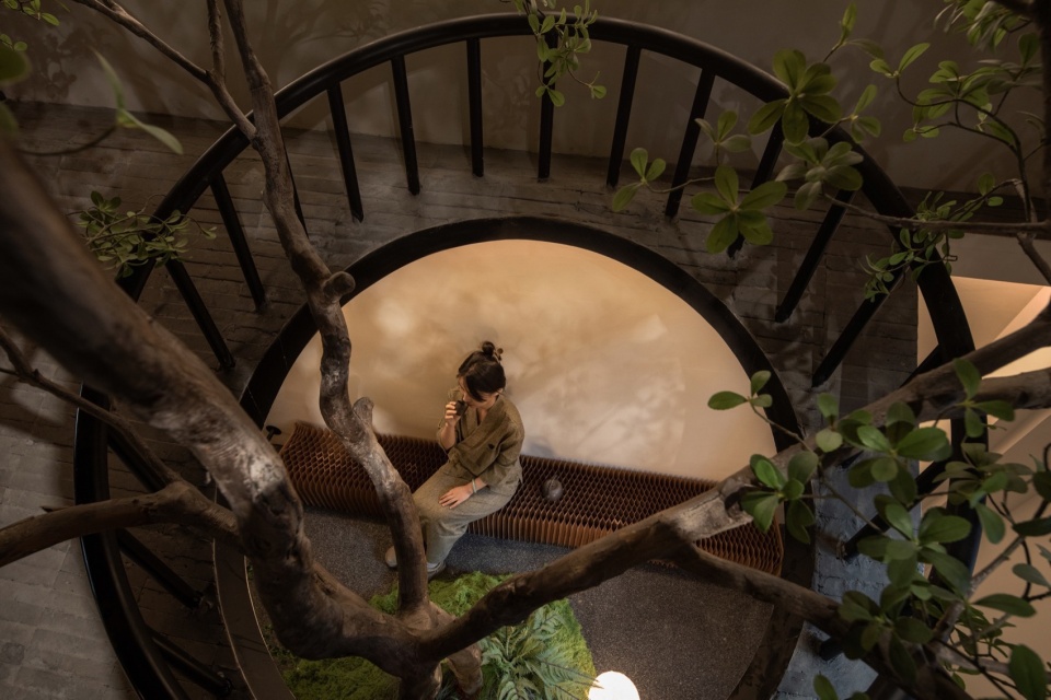 这些自然元素并非简单堆砌,而是与工业遗存的木质结构、砖石墙面相互映衬。高大的树木与厂房原有的高耸空间呼应,强化纵深感;苔藓覆盖的石块置于梁柱之下,柔化工业空间的硬朗线条。通过自然元素的植入,不仅打破了厂房封闭、机械的氛围,构建出 “茶在林间,人融自然” 的诗意意境,更实现了人工与自然的和谐共生,使茶饮空间回归宁静与松弛的本质,让顾客在品茶过程中,获得身体与心灵的双重自然疗愈 。