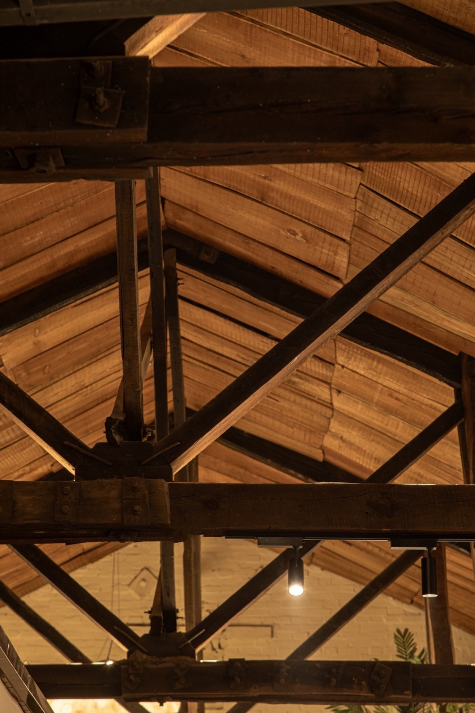保留旧厂房原始木质结构、屋架肌理,它们是时光的见证者。斑驳的梁木、质朴的桁架,带着工业时代的厚重,与茶文化的沉稳内敛相呼应,让历史记忆在空间中延续。当顾客踏入茶肆,通过对工业原型的感知,触发集体记忆共鸣,实现历史与当下的对话,契合类型学 “延续建筑文化基因” 的理论诉求 。如意大利建筑师阿尔多・罗西(Aldo Rossi)在城市建筑改造中,通过保留建筑原型元素,唤起人们对城市历史的记忆,致朴茶肆对工业原型的传承,亦是对这一理论的在地化实践 。