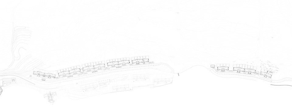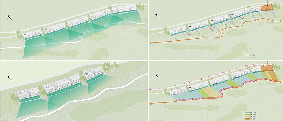 基于场地天然的地理位置,设计的第一步就是弱化材料与造型,将自然的美完全呈现出来。并考虑每一户的入户方式与后院视野,逐个解决高差与视线问题,将最好的空间体验融入场地之中。