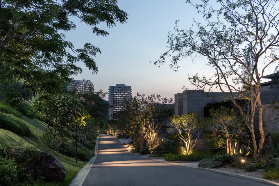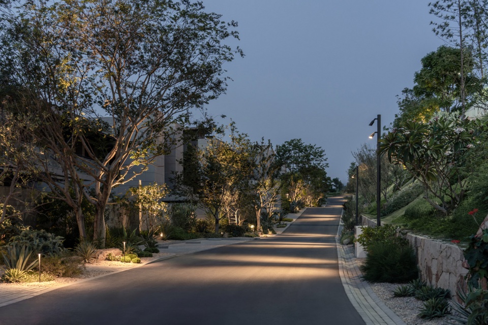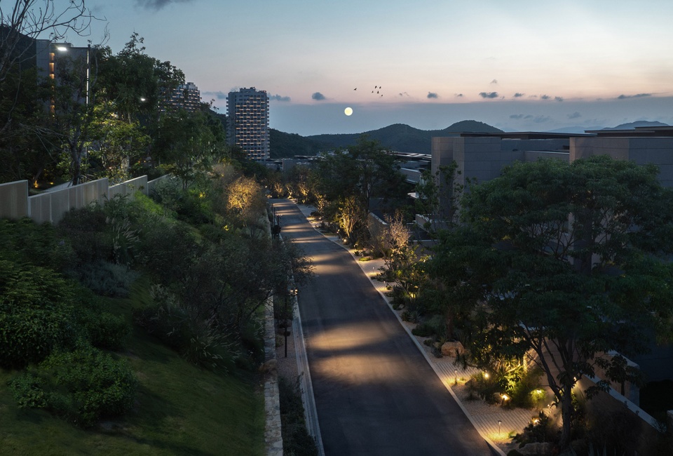▼夜幕下的入户道路,自然带来的舒适静谧,The entrance road at night, with the cosy tranquillity of nature