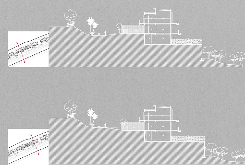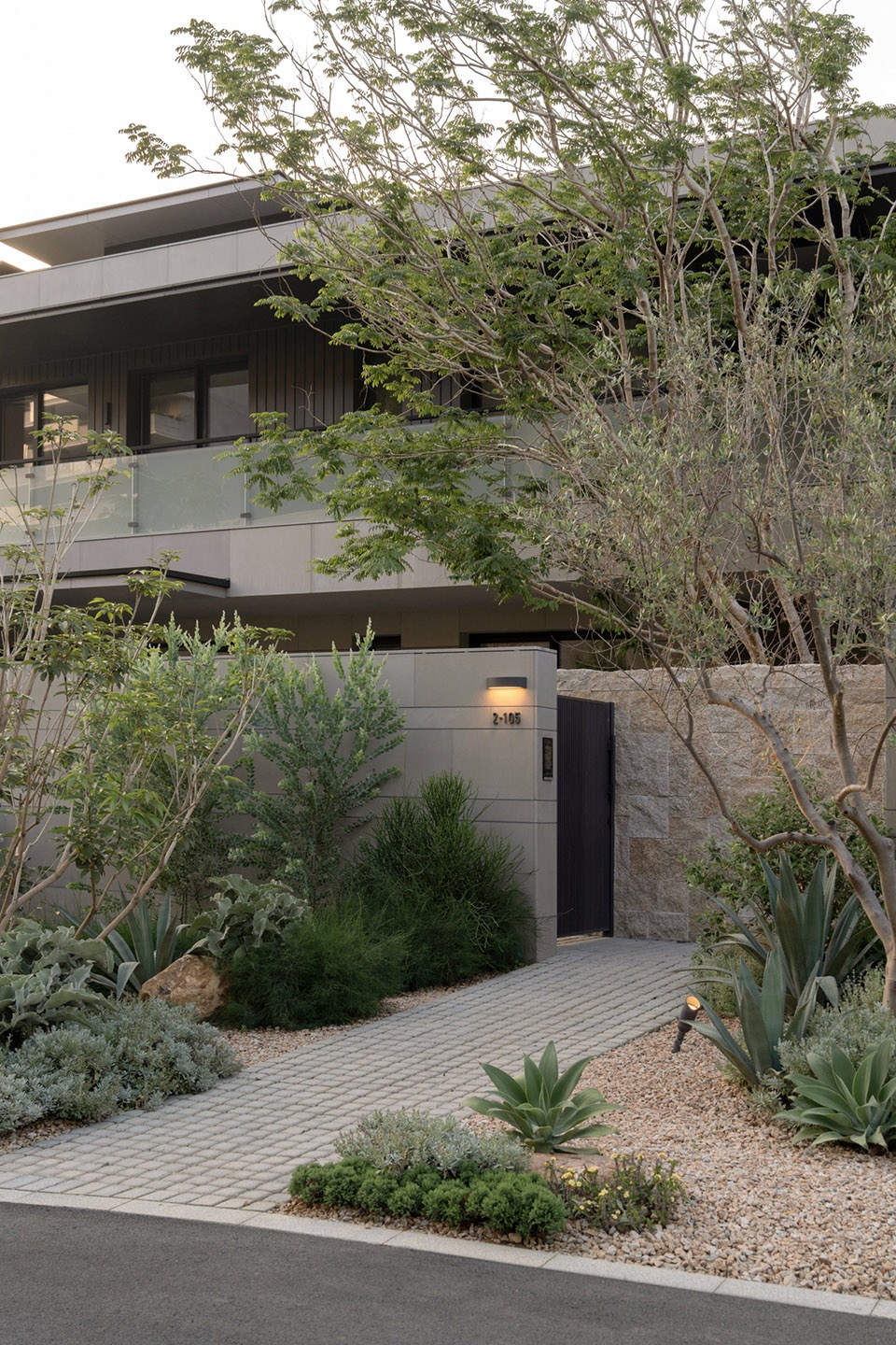 在前期规划过程中,景观已提前介入处理场地与市政道路的高差问题,设计将每户一一调整标高重新反提,以确保每户入户的最优感受。同时处理坡顶道路对于内部的私密性与降噪性,丰富植被层次,并植入隔音板。