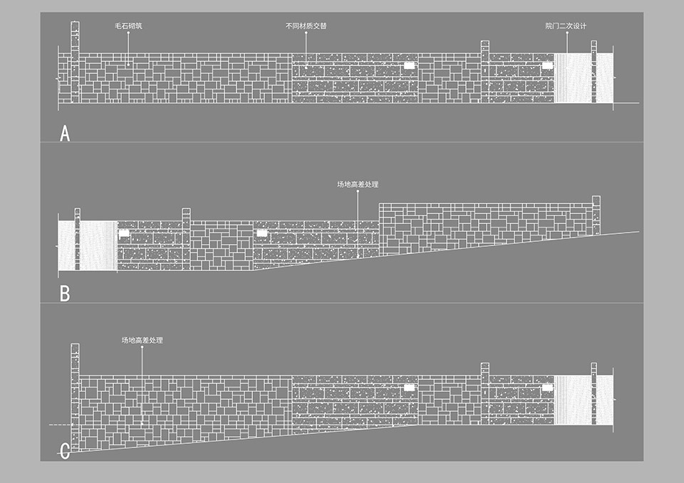 ▼左:不同高差院墙的不同做法;右:院墙石块的施工组合方式,