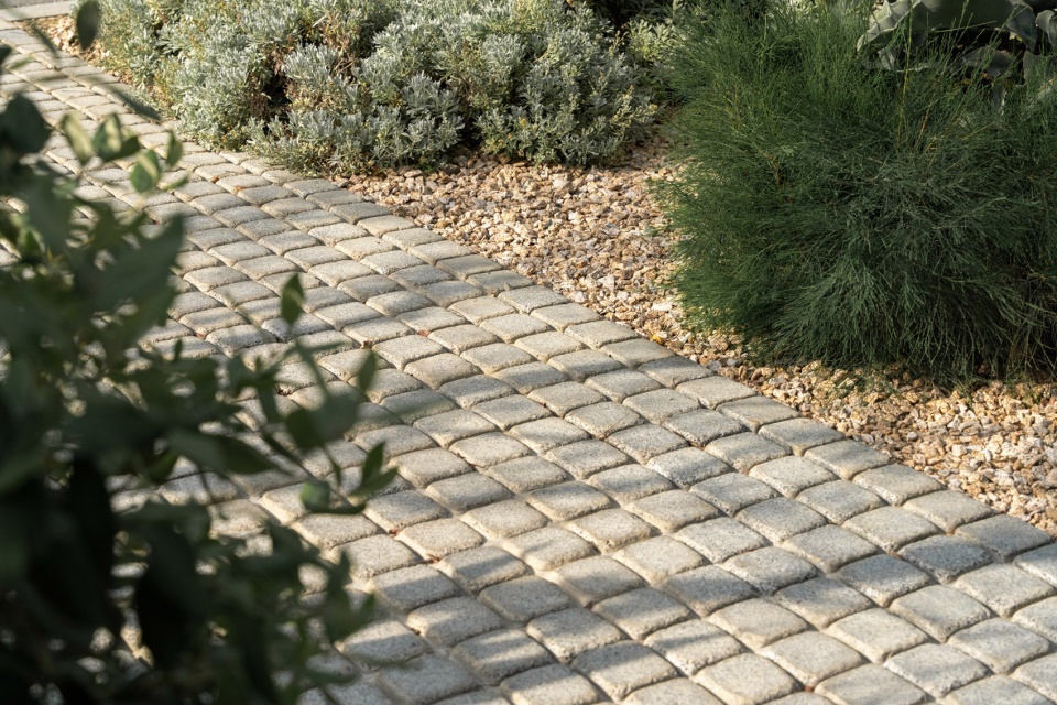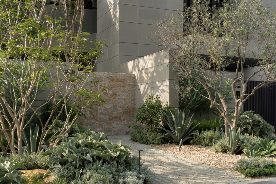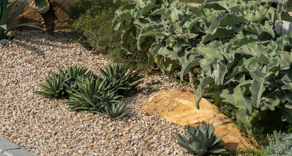▼暖色砂石与低饱和植物的和谐配色,Harmonious colour palette of warm gravel and low saturated plants