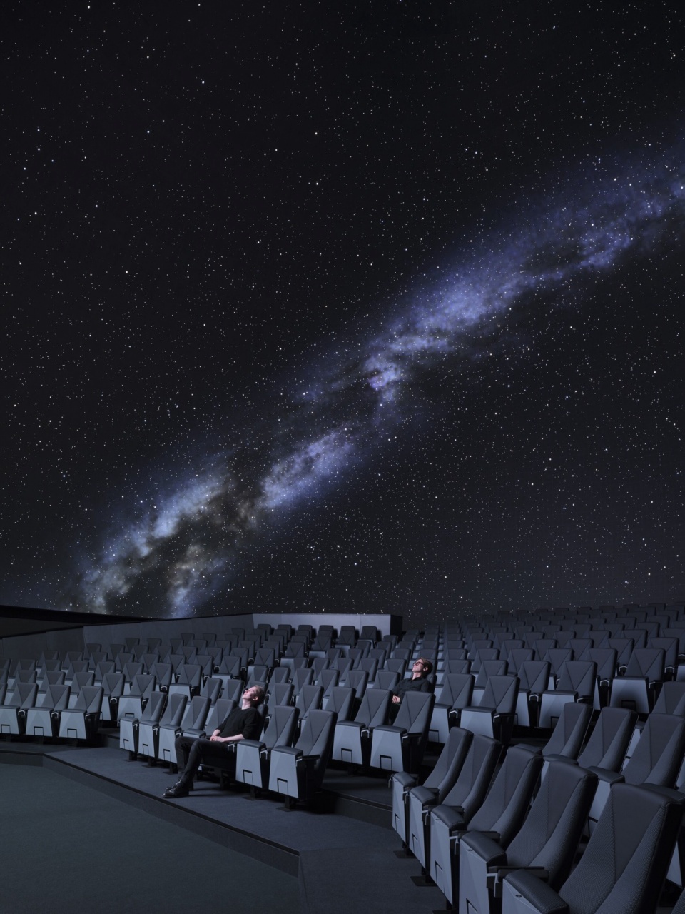The seats were custom-designed with a Czech manufacturer—they are adjustable, ergonomic, and comfortable enough to keep visitors attentive. Acoustic treatment hidden behind the projection dome further enhances the illusion of infinite space.