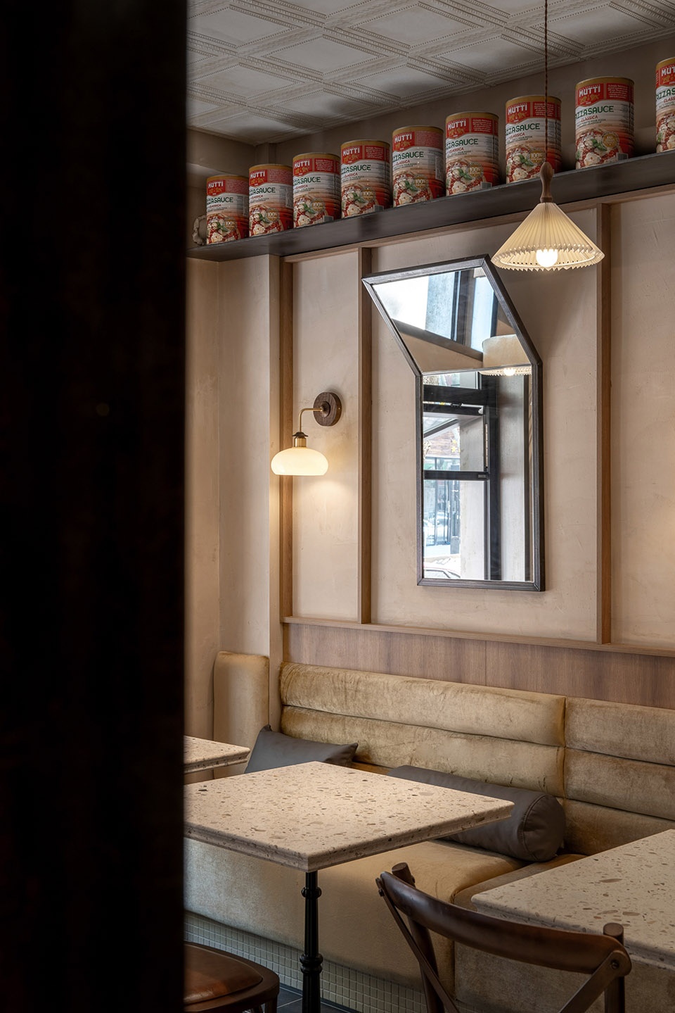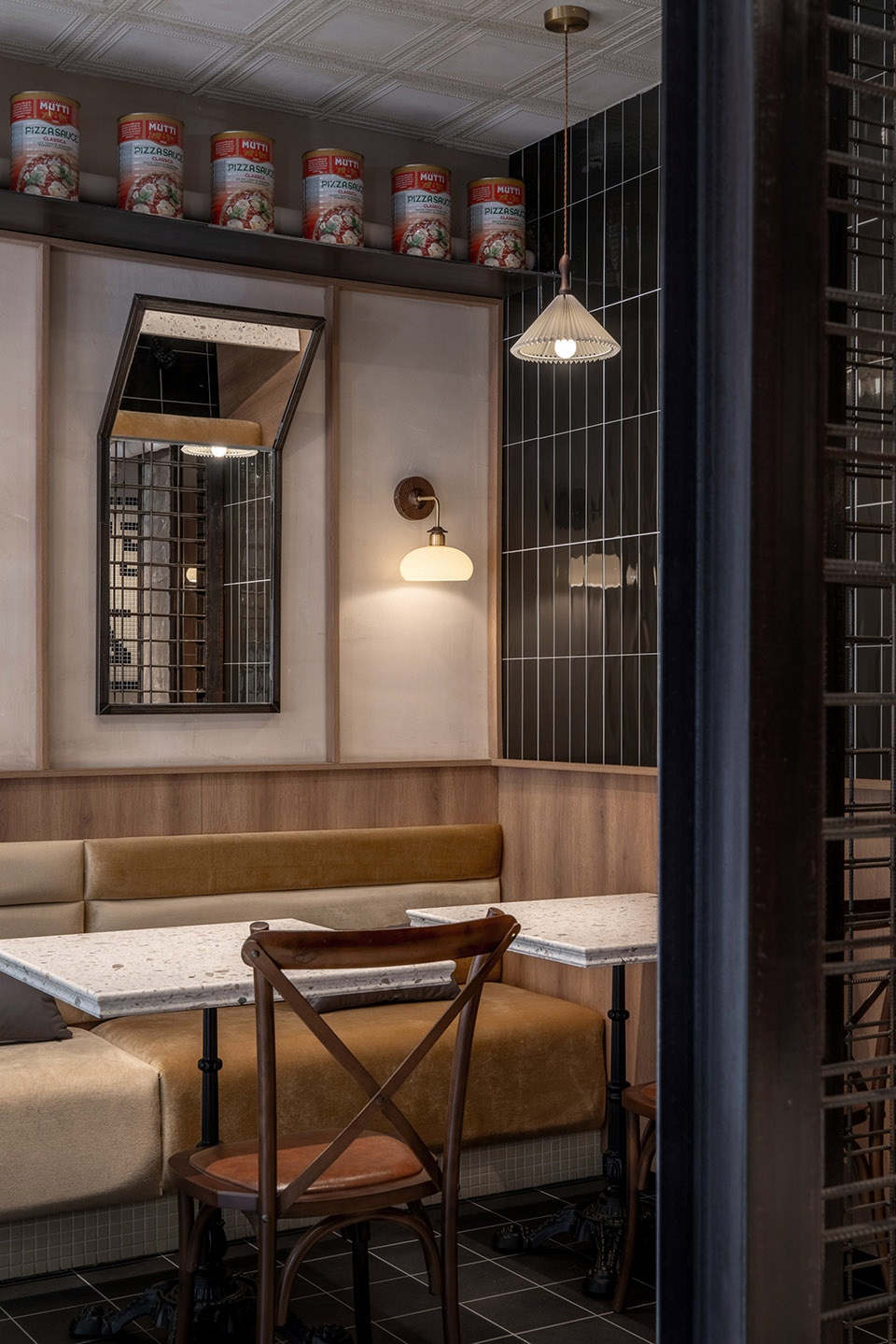 We used “thickness” as the core spatial concept, expressing it through materials. Inspired by Chicago’s industrial character in the era of deep-dish pizza’s origin, we wove industrial elements into the design.