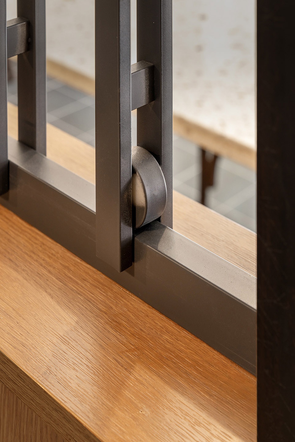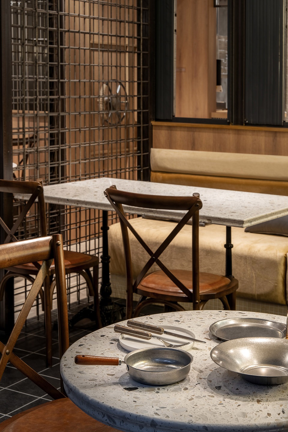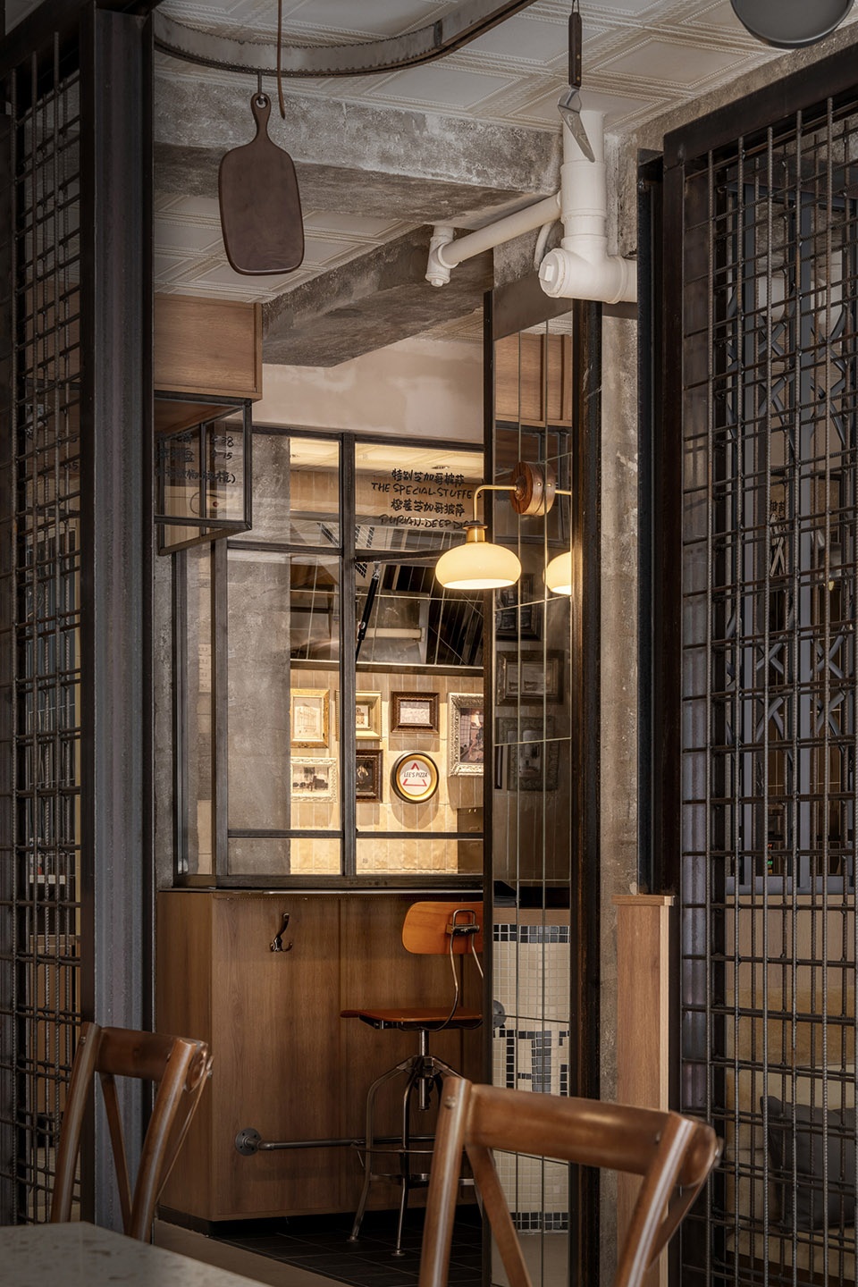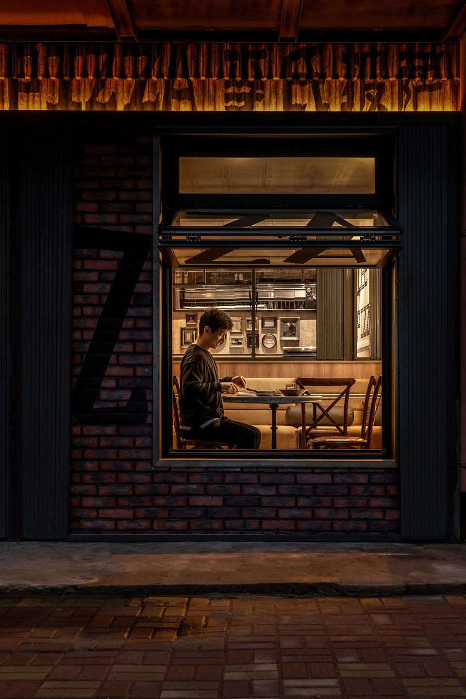 We aimed for an honest space—an open kitchen reveals the cooking process, while rotating glass panels paired with menu info create a dynamic, layered boundary.