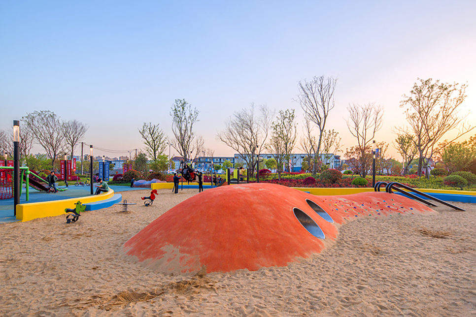 商业外围市政绿化公园,打造了一个大型绿色有氧活动场地,儿童活动场地、足球场地和篮球场地依次排布,满足不同人群的使用感受,在保证了政府要求的绿化量前提下,使几个空间丰富多彩,相互串联又保持独立。特别是全龄段儿童活动场地的打造,色彩鲜艳却纯粹,于自然之中创造童真意趣,营造不一样的儿童成长空间。