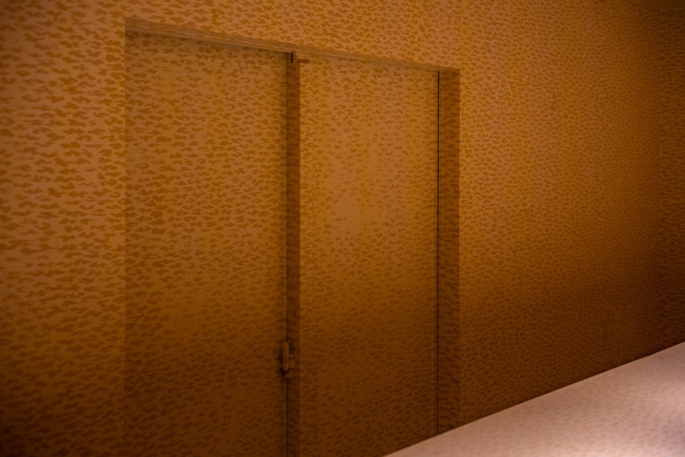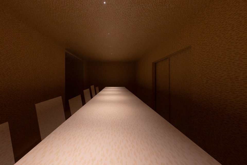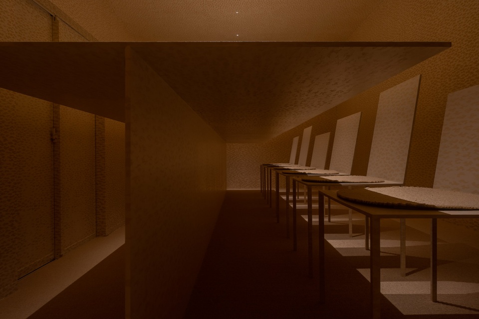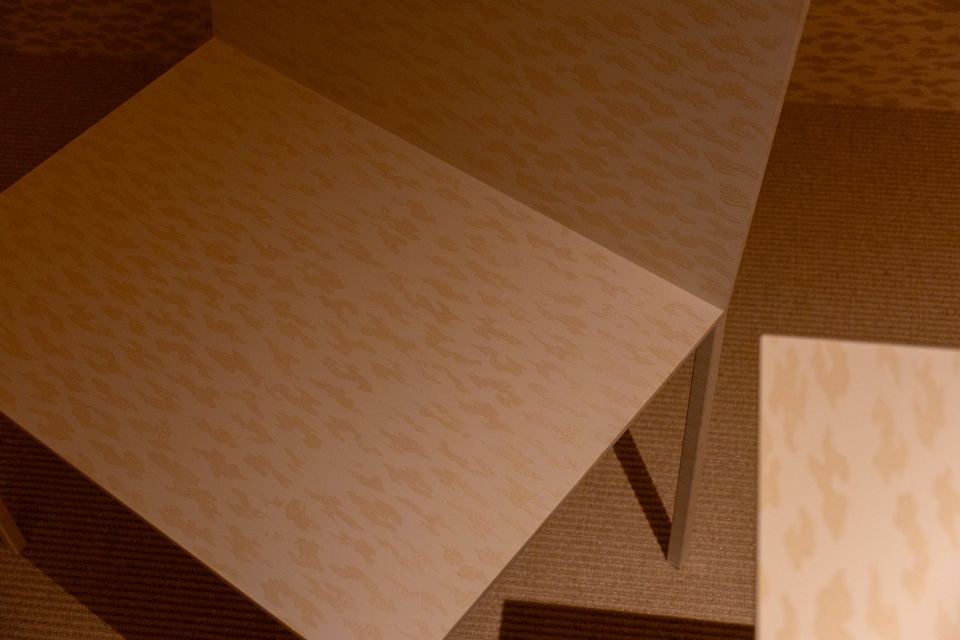 这些构成空间的印章图案,其形态被设计为模糊、抽象,使人难以将其直接联想到具象意象。这是一次回归人类“原初想象力”的持续探索,仿若人们在自然界中,通过观察月影或浮云,在不确定的形态中展开想象。印章图案在家具与墙面的转角处无缝延续,覆盖整个地面,在这片“沙沙作响的厚度”中,空间被彻底填满。整个空间呈现出一种模糊而细腻的氛围:形状似乎暗示着某种意象,却始终不被明确定义。置身其中,仿佛不断追逐着“木漏日”摇曳的光影,它总在变化,从不静止。