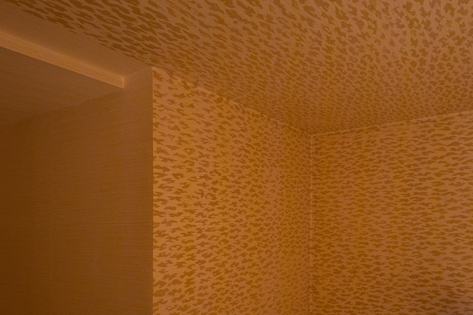 具体而言,吧台与椅子被设计为与周围空间相同的色调,并在新家具、现有墙纸与构件上手工盖印图案。这些印章图案覆盖了基底,使周围的留白空间自然凸显。印章的尺寸与间距经过精心推敲,营造出“底”(既有部分)与“图”(印章图案)之间的平衡关系,从而实现新旧元素的无缝融合。手工盖印的图案因渗墨与晕染产生不规则的肌理,柔和地覆盖在基底之上,同时又保留了其本身的肌理与痕迹。为了控制这种“非精准性”,在正式施工前进行了大量样品测试,最终的盖印过程是一气呵成、极为细致的操作。