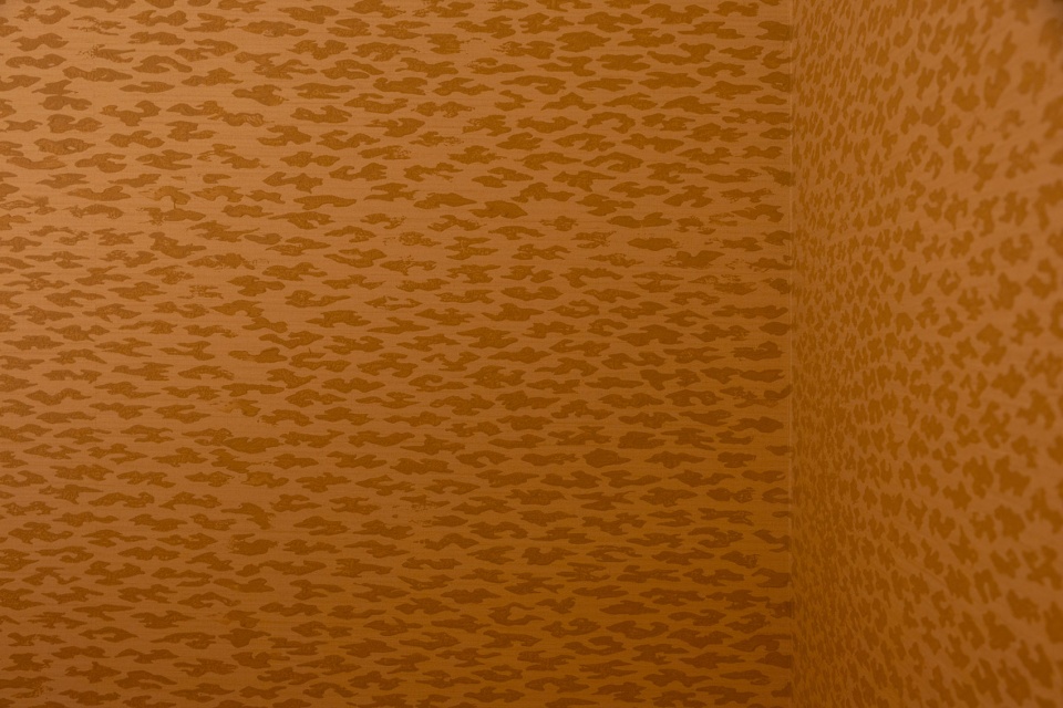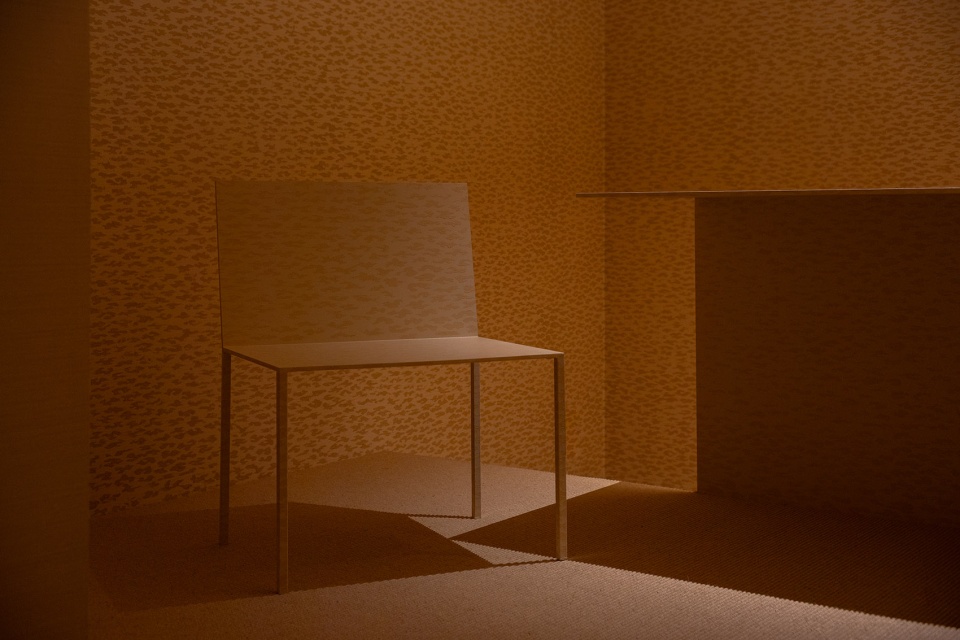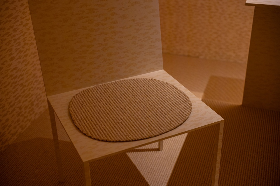 The shape of the stamps that finish the space was designed to be vague and abstract, making it difficult to associate them with specific images. This is the result of continuous study that returns to the fundamental imagination of humanity. It’s similar to how people expand imagination by recognizing forms in nature, such as finding forms in the moon’s shadow or drifting clouds. The stamps continue seamlessly, across the corners of the furniture and walls, and the rustling thickness on the ground is captured and fills the entire room. The space feels vague and delicate, where forms seem to suggest something, yet never resolve into anything defined. The experience of being in this space feels like endlessly following the swaying shadows of