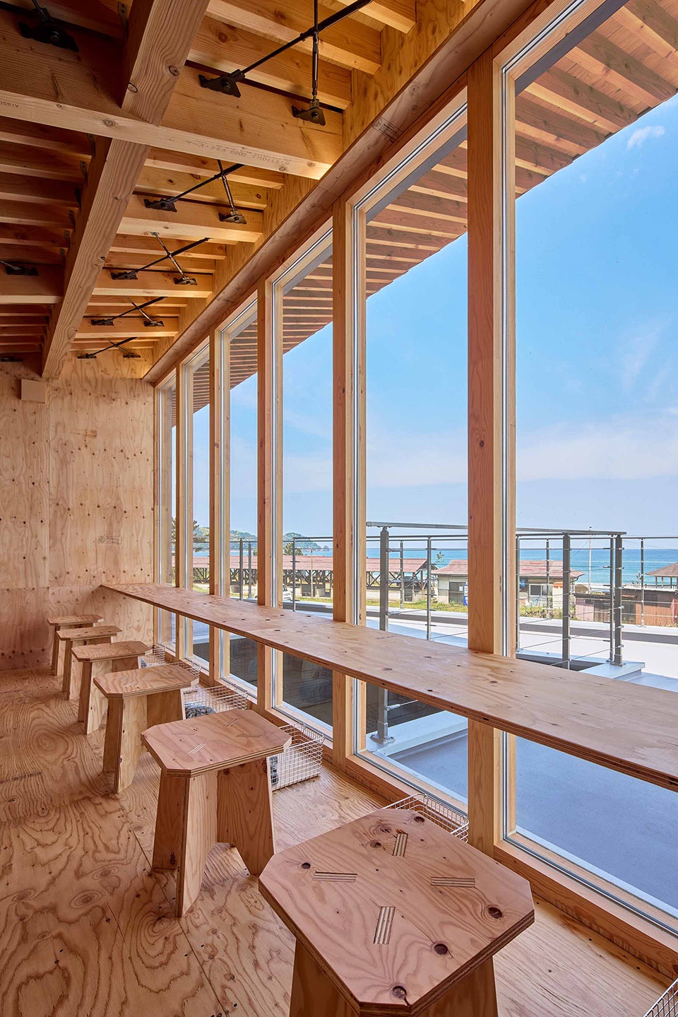 我们受托在这片毗邻国家地质公园的区域建造一座永久性的海边小屋。前方设有由镇上管理的户外烧烤区,每年吸引超过2,000人前来,浅滩拥有极佳的海浪条件,因此也吸引了众多冲浪爱好者。然而,曾经有数十家民宿的地区,如今只剩寥寥数家,人口减少和高龄化问题日益严重。虽然这里是JR西日本豪华观光列车“瑞风”的停靠站之一,但住宿设施稀少,观光资源未能充分发挥作用。