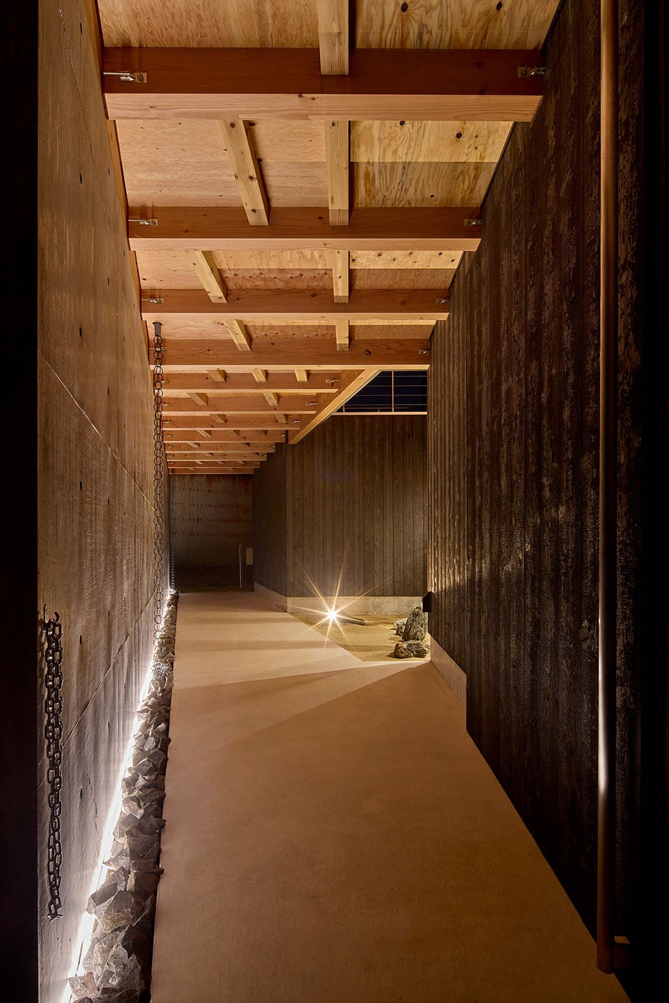 By using natural materials, we designed it with the neighborhood in mind. Interior: structural plywood exterior: burnt cedar roof: galvalume steel sheet (original sheet)