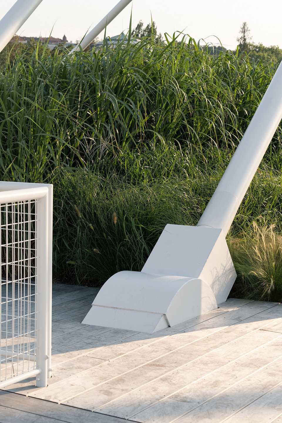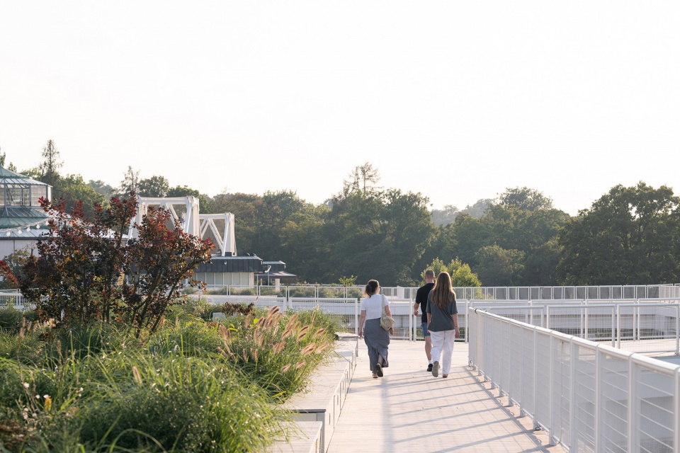 改造前,屋顶全部由深色混凝土铺装构成,在白天吸收大量热量,形成“热岛效应”,使周边温度升高1至3摄氏度(夜间甚至可达10摄氏度)。此次改造共减少了约5000平方米的混凝土面积。屋顶种植的密集型绿色植被有效减缓了空气与尘埃流动,带来更加宜人的局部气候。植被不仅能够释放氧气,还能提高空气湿度,进一步改善空气质量。全新的屋顶结构结合了蓄水层、绿植区与可行走铺面,每年可减少约1000立方米雨水直接排入市政排水系统。这部分雨水被储存在绿色层中,用于植物生长和自然蒸发。
