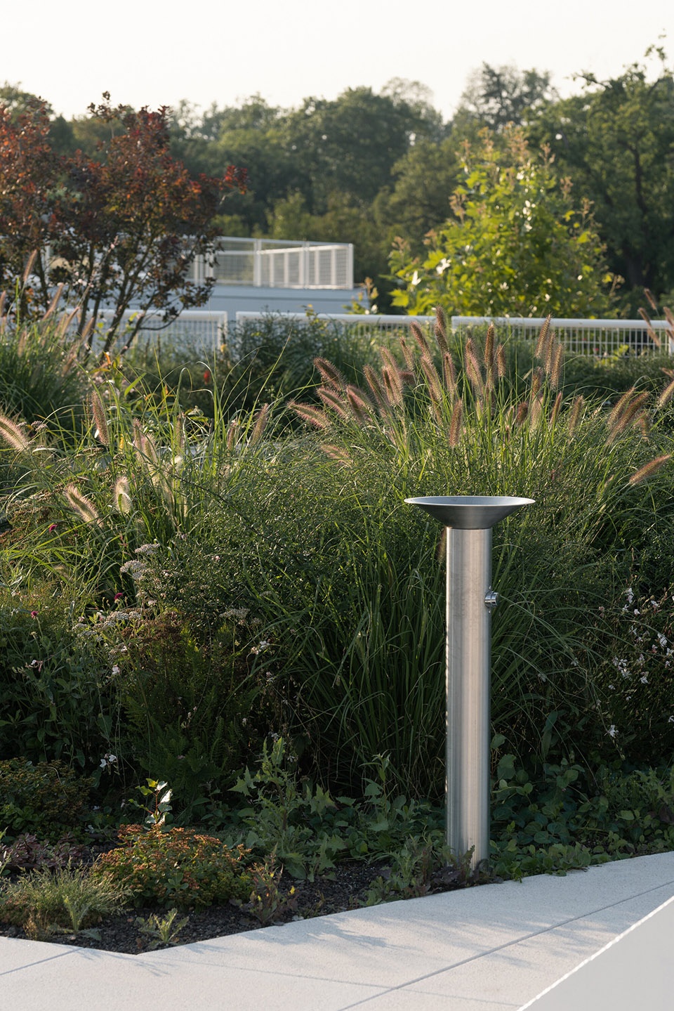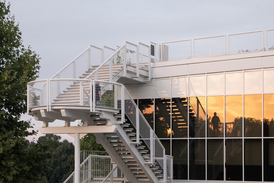 Originally, the entire roof surface was made up of dark concrete paving, which absorbed a huge amount of heat during the day, creating a “heat island” effect, raising the temperature of the surrounding area by 1–3°C (in the evening it can be up to 10°C). The total concrete area was reduced by about 5000 m2. The intensive vegetation planted on the roof slows down the movement of air and dust, resulting in a significantly more pleasant local climate. In addition to oxygenating the air, the greenery also increases the humidity of the air, thus positively influencing its quality. The new layering of the service roof (combination of green intensive roof with accumulation layer and walking surfaces) reduces the amount of storm water discharged to the site sewer by about 1000 m³/year. This amount remains accumulated in the green roof layer during rainfall and is subsequently used for green growth and evaporation from vegetated areas.