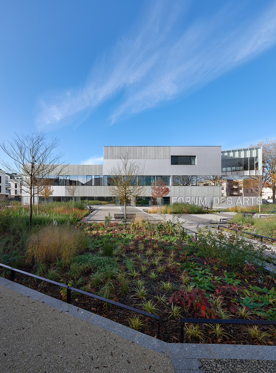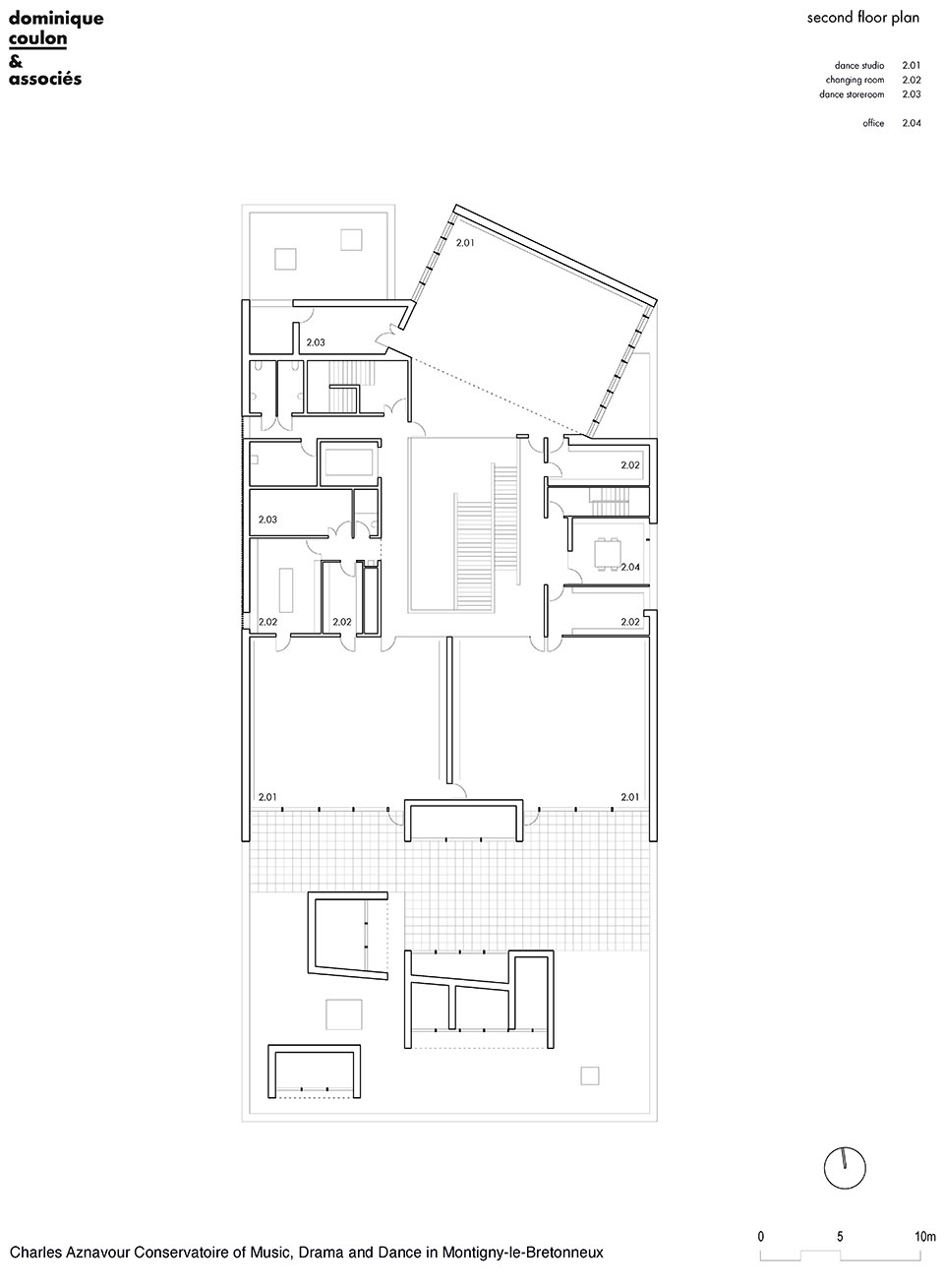 The music, drama and dance academy building in the new town of Montigny-le-Bretonneux stands on a triangular site. It offers distant views of the famous apartment block Les Arcades du Lac that Ricardo Bofill made in 1985.