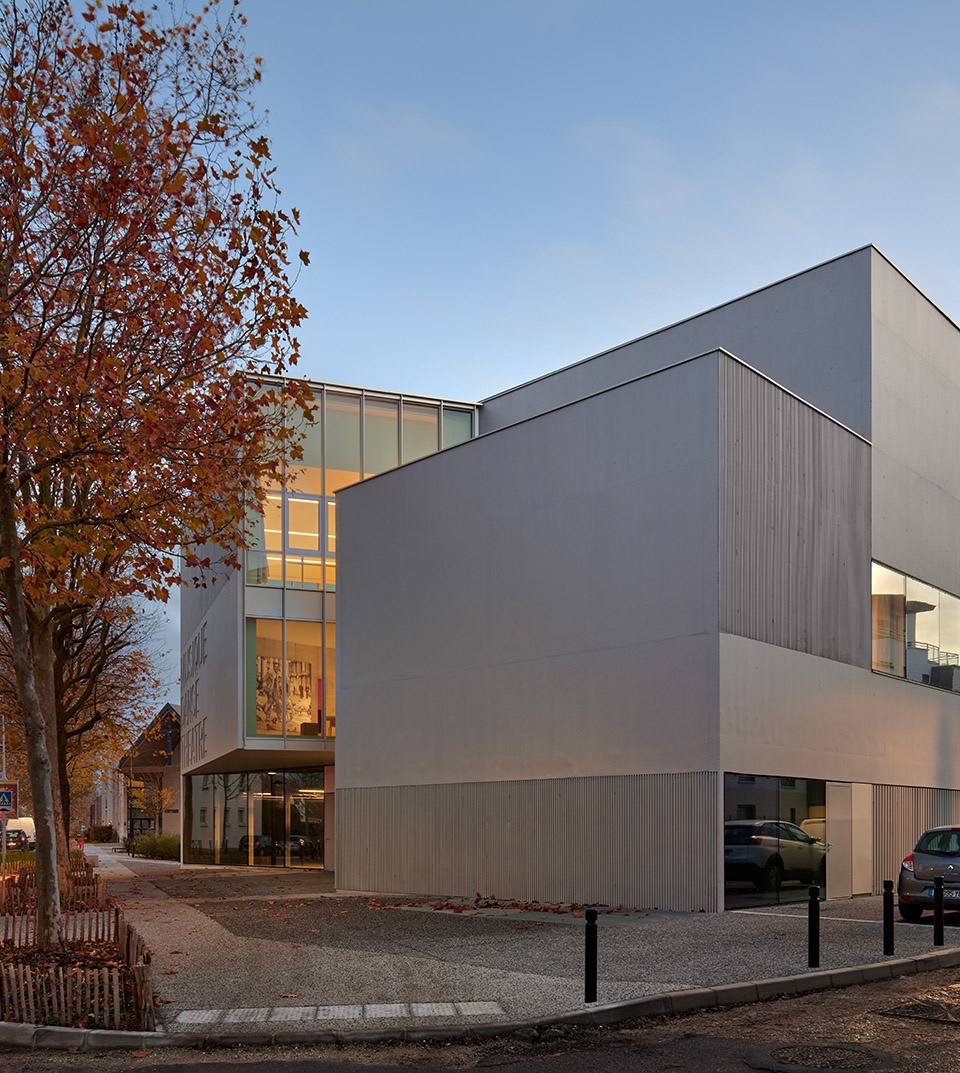 The building has four levels. It includes drama rooms, a large black-box auditorium, music rooms of different sizes, a recording studio, three dance rooms with changing rooms, and an underground car park. The spaces are spread along an uneven axis that generously offers convivial areas looking out at the town or the building’s main sections.