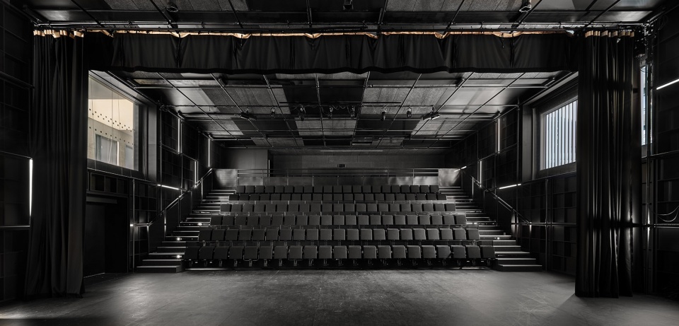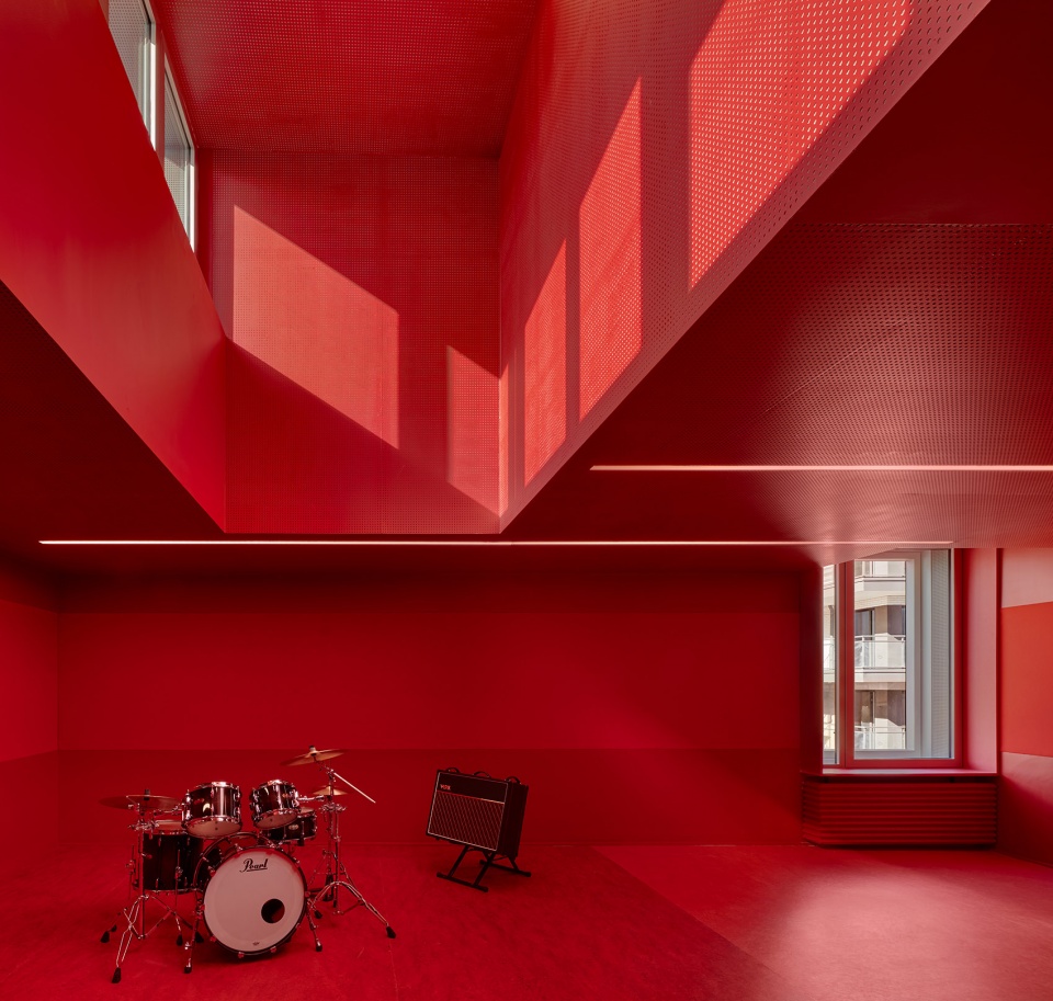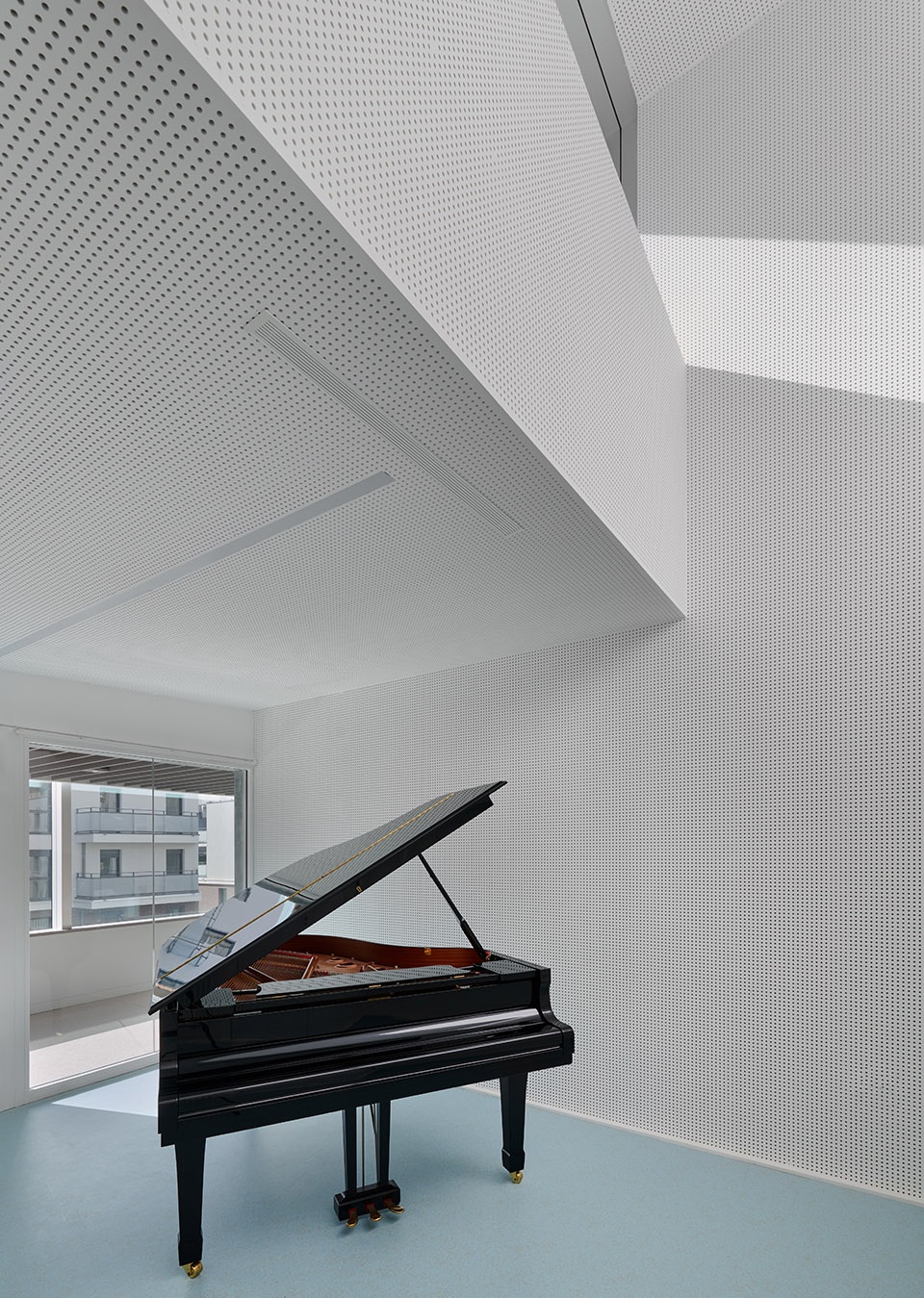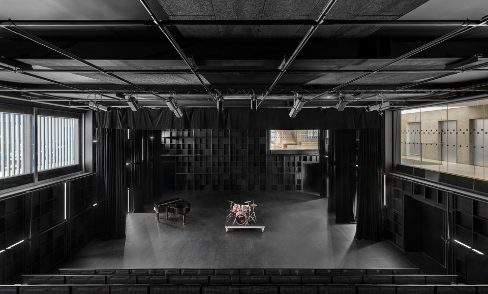 走进入口大厅,映入眼帘的是两个高挑的地下空间:一个是洞穴般的剧场,另一个是拥有双层层高的打击乐教室,透过玻璃可以俯瞰乐器陈列。