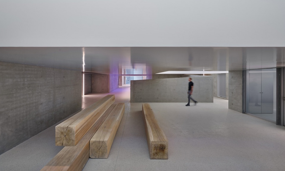 ▼裸露的混凝土墙面与光滑的地面和天花板形成对比,walls of exposed concrete juxtapose shiny floors and ceilings