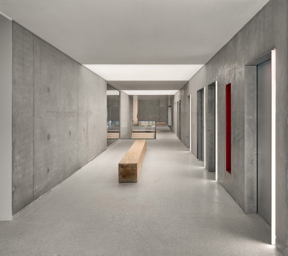 建筑的走廊展现出强烈的对比感:裸露的混凝土墙面与光滑的地面和天花板相映成趣。各楼层还点缀着大块实木构件,为交流空间增添了温暖与亲切感。