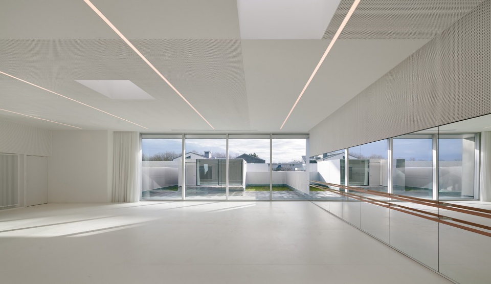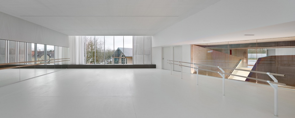 The compact building seems to turn to face south, to enjoy a better, right-angled view of the street. The structure seems to come apart to showcase the true size of its dance studio, which pivots to lie parallel with the road. Different forms collide, reflecting the site’s geometry. They offer vistas of the town and clear views of the interior.