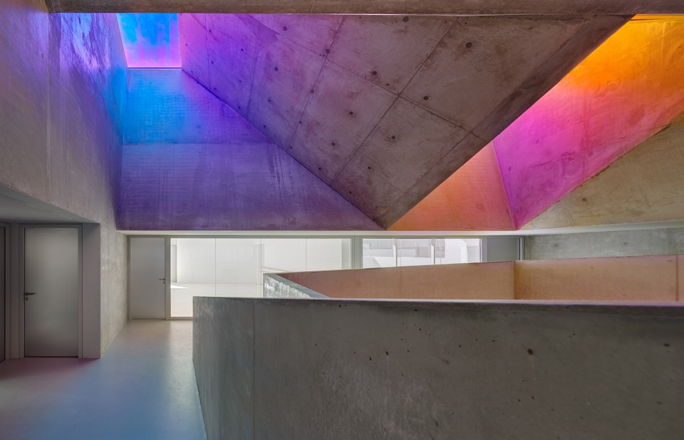 建筑的纵剖面图最能说明各空间之间所建立的强联系。三处大型天窗打破天花板的平整性,让自然光从各个角度洒入。一个纪念碑式的楼梯在中庭中斜向展开,一路延伸至上层的光线与舞蹈空间。大面积玻璃上贴有二向色薄膜,其色彩会随着观察者的位置和阳光的角度而不断变化。这一巨型万花筒般的构造将空间串联起来,营造出流动变化的色彩氛围。