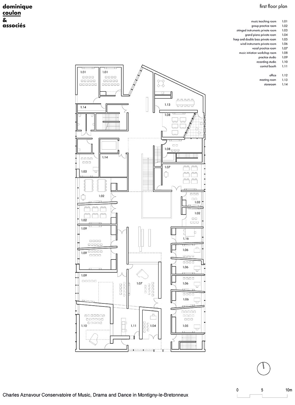 建筑共设四层,包含戏剧教室、大型黑匣子剧场、不同尺寸的音乐教室、录音棚、三间舞蹈教室及其更衣室,以及一个地下停车场。各个空间沿着一条不规则的轴线展开,沿途设有面向城市或建筑核心区域的开放交流空间。