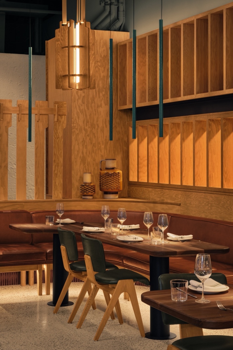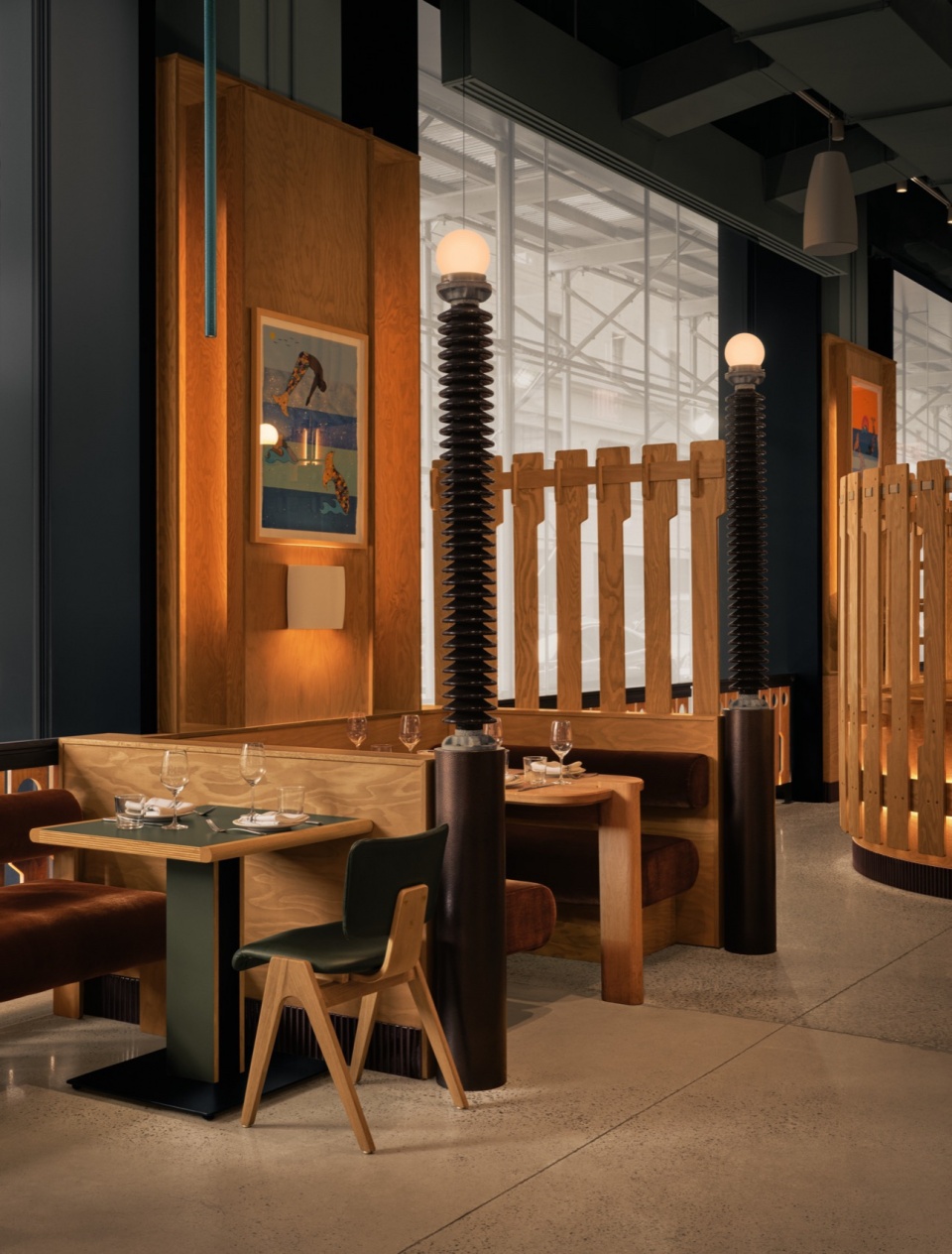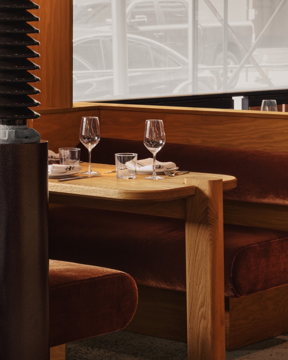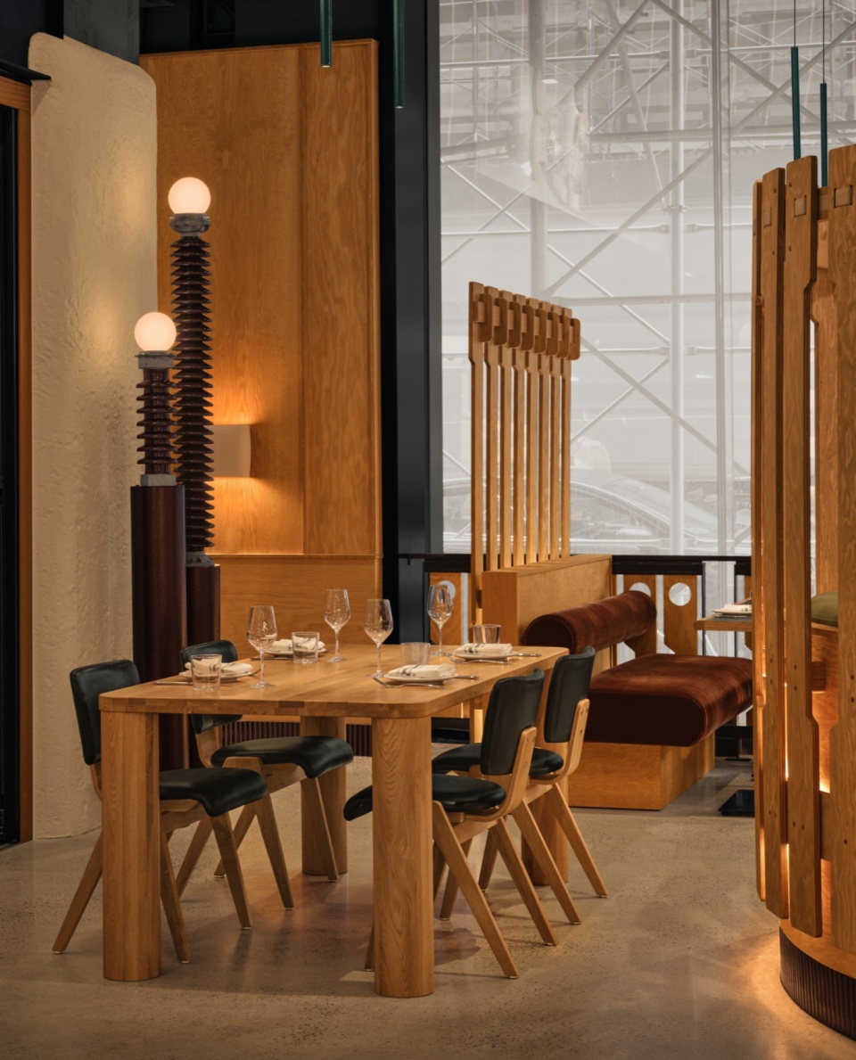 面对这处曾为工业用途的空间,Atelier Zébulon Perron以温暖的介入方式展开设计,选择胶合板作为构建Hav & Mar独特气质的基础材料。胶合板具有多样的表现力,贯穿于整个设计之中,应用于墙面和分隔构件,并用于支撑照明装置的结构组合。此外,Hav & Mar的私密卡座围合结构也采用了胶合板打造,赋予其独特的质感与形式。