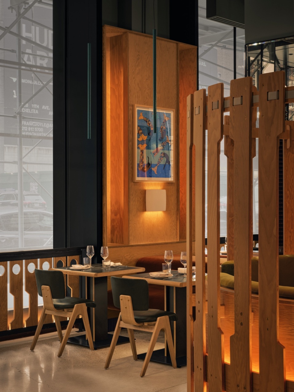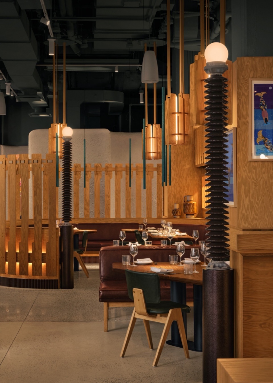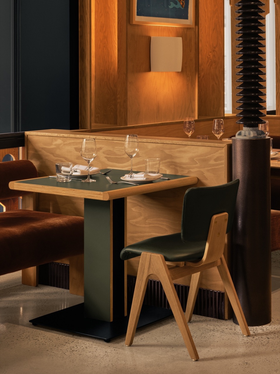 面对这处曾为工业用途的空间,Atelier Zébulon Perron以温暖的介入方式展开设计,选择胶合板作为构建Hav & Mar独特气质的基础材料。胶合板具有多样的表现力,贯穿于整个设计之中,应用于墙面和分隔构件,并用于支撑照明装置的结构组合。此外,Hav & Mar的私密卡座围合结构也采用了胶合板打造,赋予其独特的质感与形式。