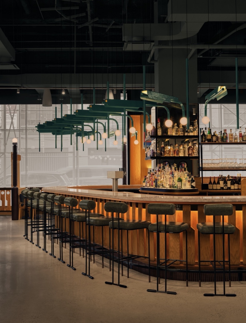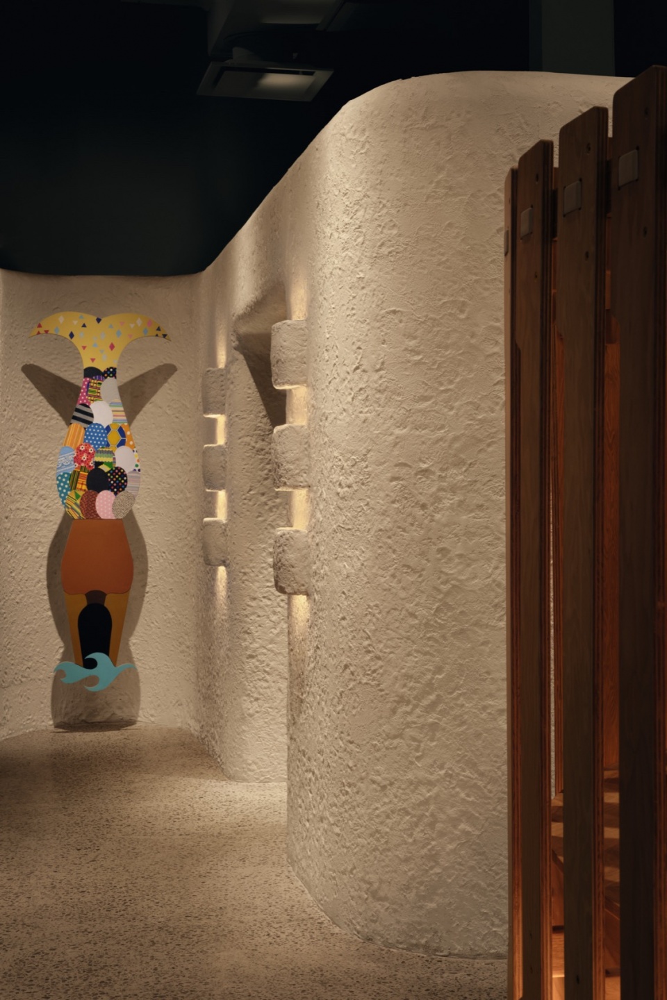 主吧台自身也拥有鲜明的存在感,其上方悬挂着一盏颇具“海洋生物”气息的大型灯具,造型异想天开、引人好奇。这件装置不仅是视觉焦点,也具备实际功能——它如同一个“穹顶”将空间尺度收束至贴近人感的尺度。整体设计注重垂直维度的组织,通过从天花板、地面到墙体各处的元素布置形成丰富的空间层次。每个元素均通过定制灯具进行艺术化照明,这些灯具既是雕塑性构件,也是各种光影氛围的发光载体。