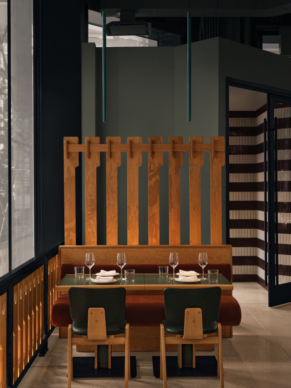 Hav & Mar’s open kitchen concept further contributes to the concept of flow and interaction, with the main bar prominently positioned directly in front of it. To further maximize floorplan efficiency, Atelier Zébulon Perron created a private booth as an articulated sub-space just off of the bar and kitchen area, essentially converting what might otherwise be the worst seat in the house into one of the most coveted seating options.