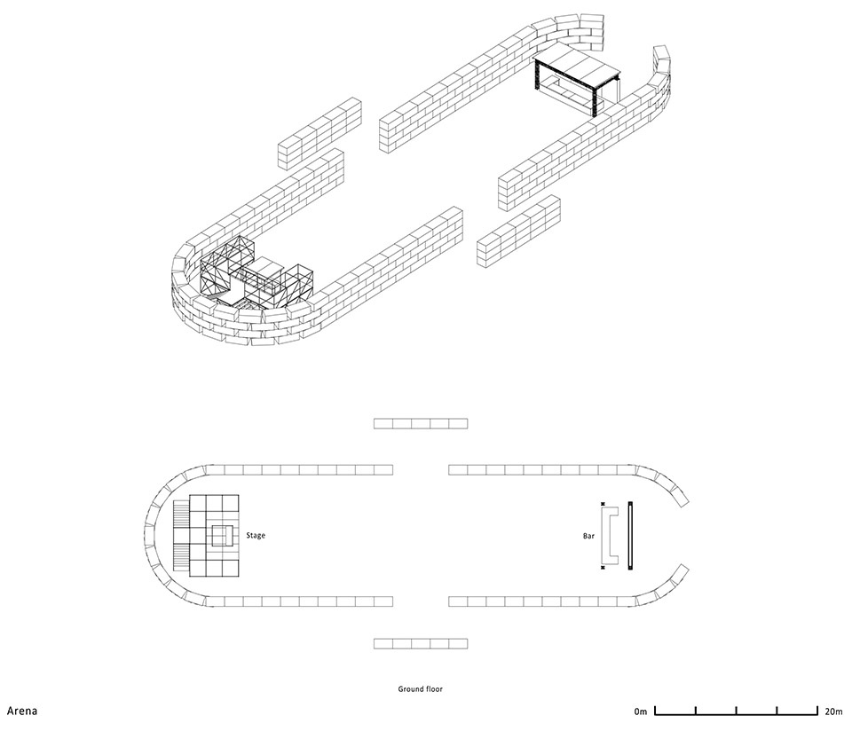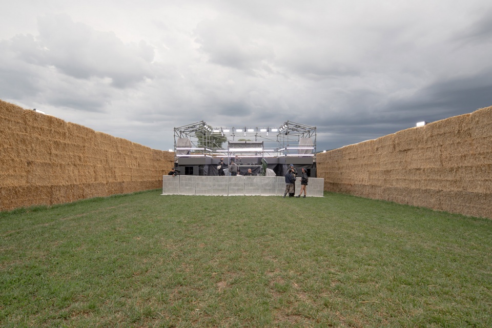我们将此区域命名为“Arena”,其设计响应了最小化对周边区域噪音影响的要求。主结构材料为稻草,具备良好的声学性能、施工便利性与可回收性,是实用且富功能性的解决方案。场地位于葡萄园之外,呈对称布局,形成顺畅的流线组织。通过纵向轴线上两个主要入口及靠近酒吧区的北侧入口进入。舞台位于北侧,位置上反而最接近入口。该区域设计可容纳约1750至2000人,兼顾效率与舒适性。