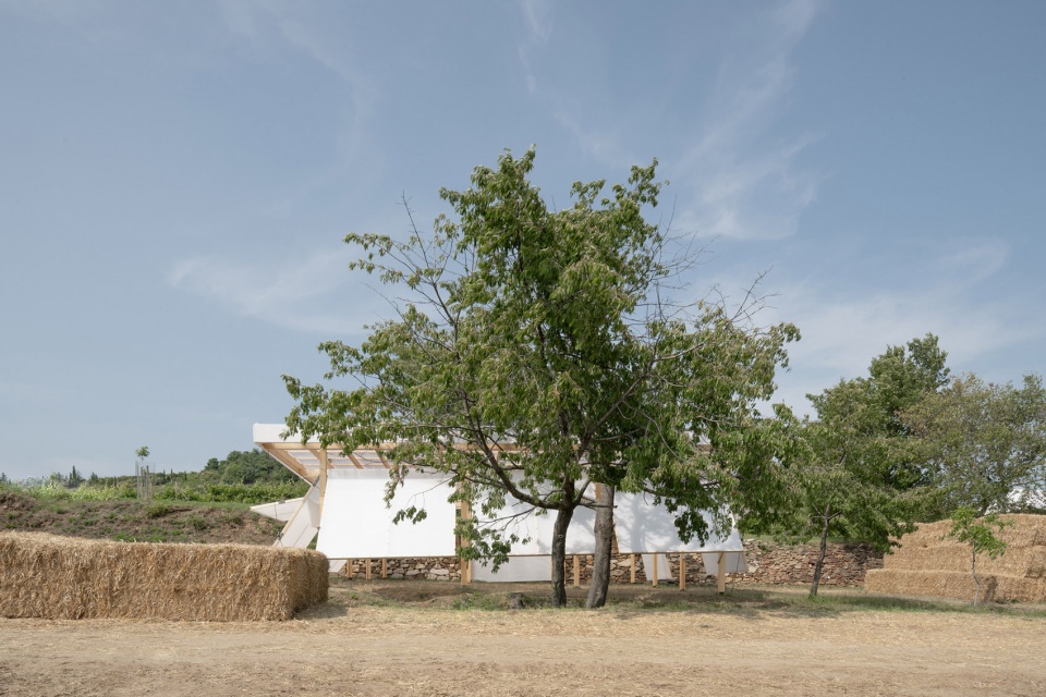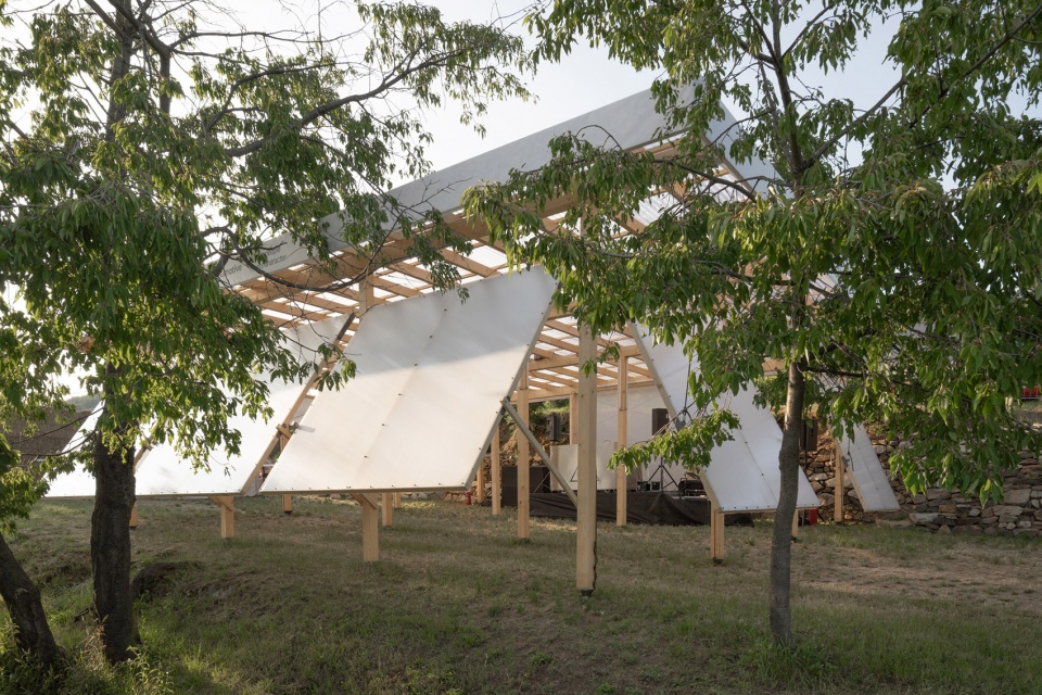 “秘密舞台”展亭是一处具有可变声光界面的空间,设计时重点考量其声学可调性,以适应昼夜不同的使用场景。建筑为轻质木结构,采用4×4米的规则柱网和平屋顶,立面配有可旋转板片,实现空间的开闭变化。白天展亭打开,与周边葡萄园自然通风相通;夜晚则封闭,转变为俱乐部氛围。与其他临时结构不同,秘密舞台为永久性建筑,因为当地市政府希望将其作为旅游设施保留。立面材料为半透明乳白聚碳酸酯,柔和散射自然光与人工照明。