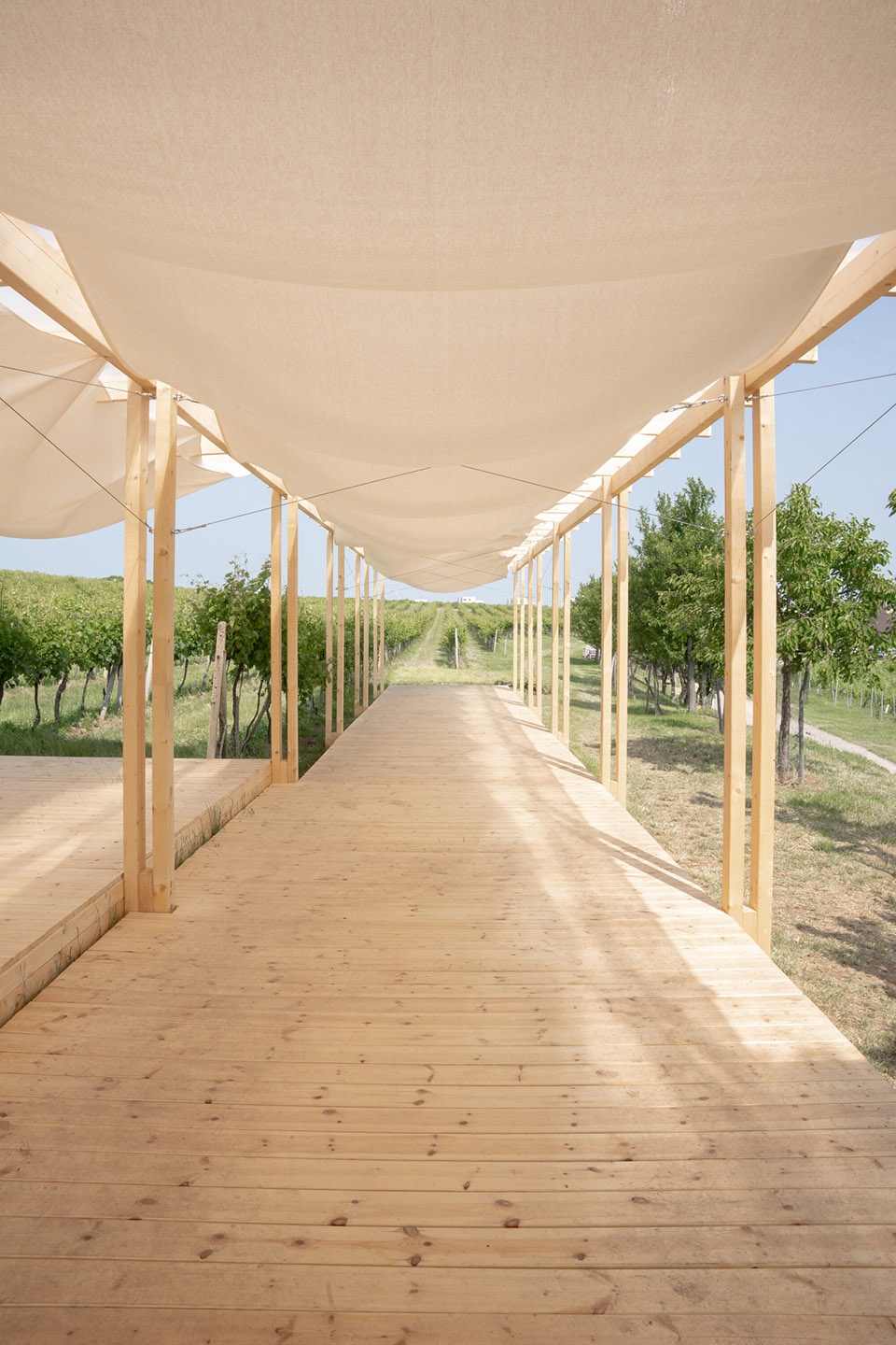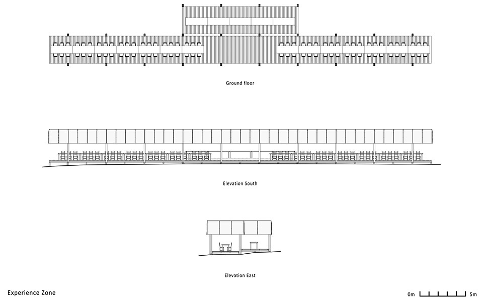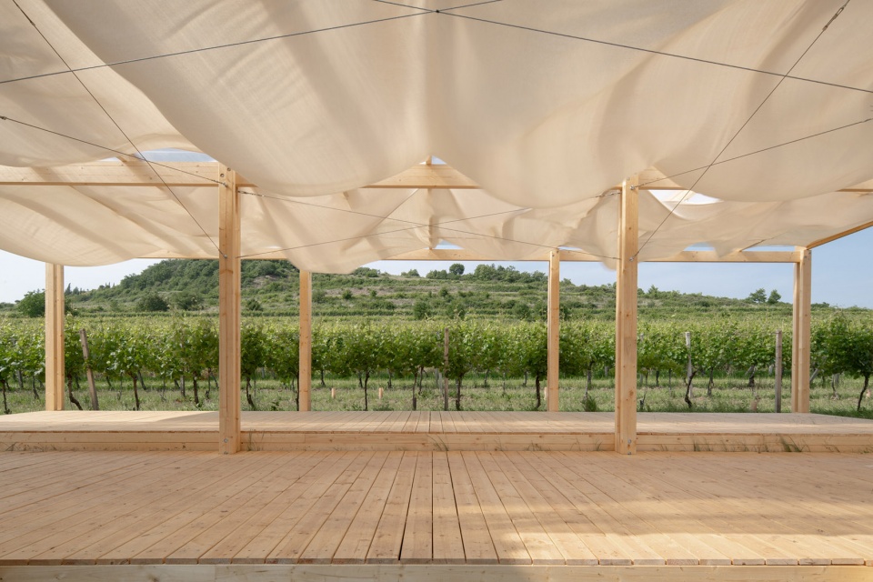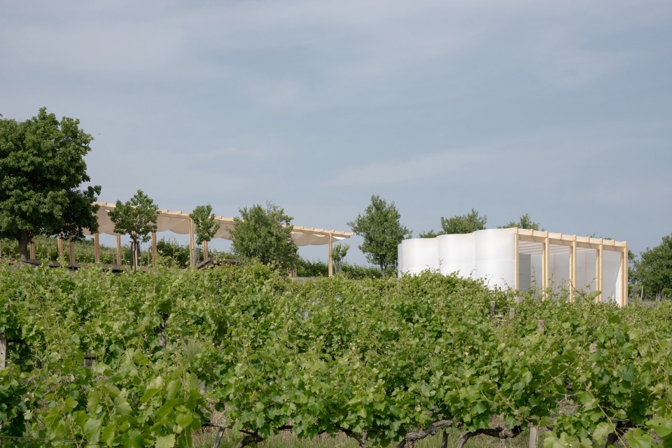 “体验区”展亭可容纳约150位访客,设计上强调在舒适就座的同时配合餐饮体验。空间构成采用重复的纵向木结构单元,与葡萄园行列节奏相呼应。屋顶配有织物帘幕与悬挂布顶,并结合灯光营造乡村氛围。结构沿纵向布置,节奏感强,木柱与织物元素共同融入葡萄藤行之间。整个结构对称展开为左右两翼,中部设置为后勤及餐饮支持区域。