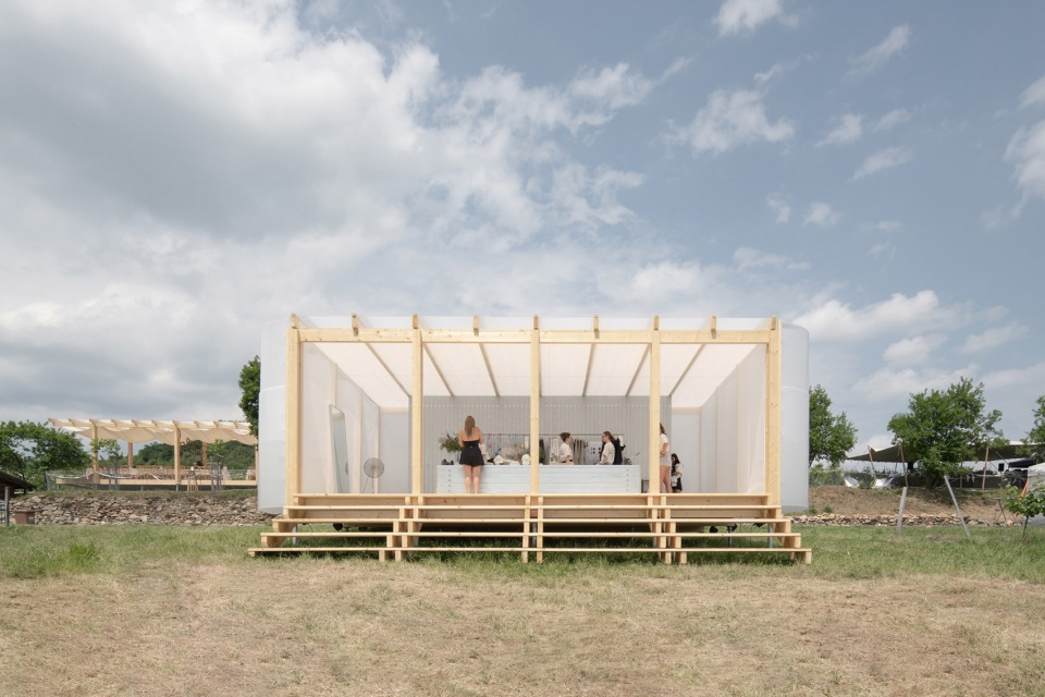 “概念商店”展亭为节庆纪念品的多功能零售点,位于其所属区域的入口处,成为入口与下方休闲区之间的过渡门户。其北侧立面封闭,南侧面向葡萄园开放,并设有台阶式座席,缓解地形高差,使展亭自然融入景观。结构上采用木柱支撑平屋顶,外覆弯曲的乳白聚碳酸酯板材,其散射特性使建筑在夜间尤为醒目。室内设计强调材料再利用,结合简洁钢构件与不锈钢家具,在质感上与葡萄园自然环境形成对比。
